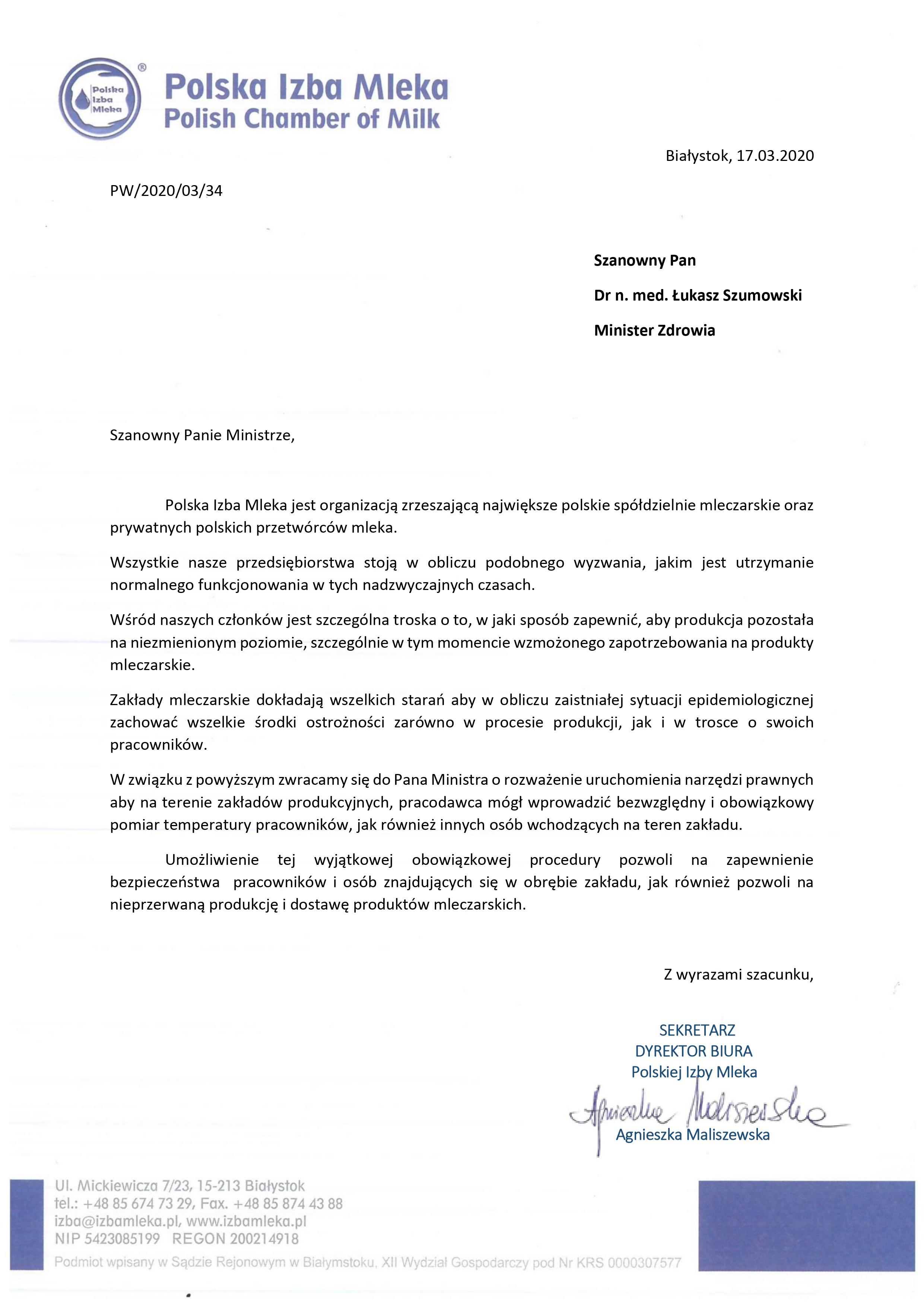 Agnieszka Maliszewska, dyrektor Biura Polskiej Izby Mleka zwróciła się do Pana Ministra o rozważenie uruchomienia narzędzi prawnych aby na terenie zakładów produkcyjnych, pracodawca mógł wprowadzić bezwzględny i obowiązkowy pomiar temperatury pracowników, jak również innych osób wchodzących na teren zakładu.