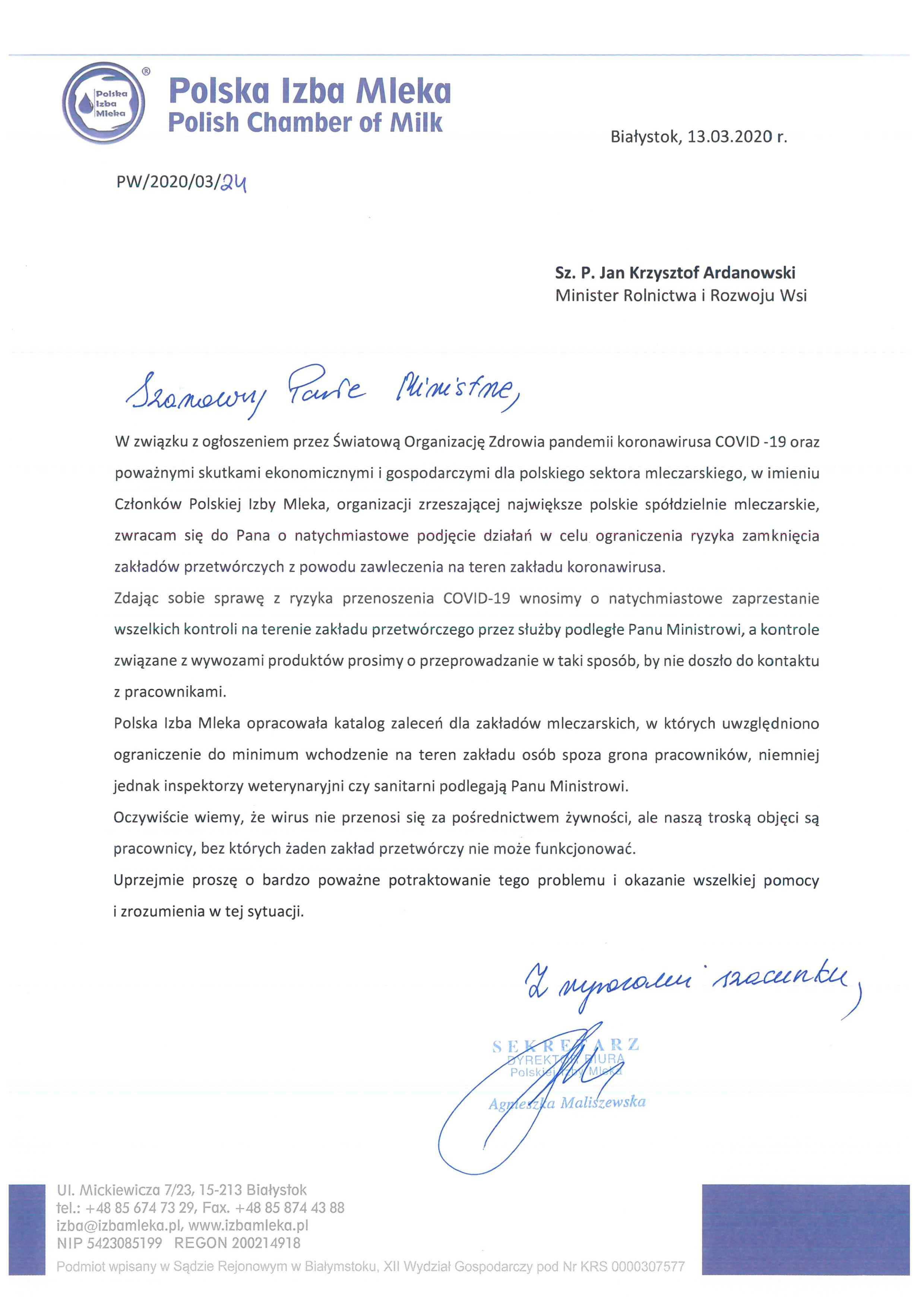 W związku z ogłoszeniem przez Światową Organizację Zdrowia pandemii koronawirusa COVID -19 oraz poważnymi skutkami ekonomicznymi i gospodarczymi dla polskiego sektora mleczarskiego, w imieniu Członków Polskiej Izby Mleka, organizacji zrzeszającej największe polskie spółdzielnie mleczarskie, zwracam się do Pana o natychmiastowe podjęcie działań w celu ograniczenia ryzyka zamknięcia zakładów przetwórczych z powodu zawleczenia na teren zakładu koronawirusa.