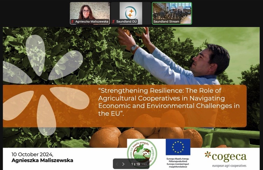 Agnieszka Maliszewska koncentrując się na kluczowej roli, jaką spółdzielnie rolno-spożywcze odgrywają w promowaniu zrównoważonego rozwoju, wygłosiła prezentację online na Konferencji Współpracy Rolniczej w Tartu dnia 10 października 2024 r. Przemawiając do szerokiej publiczności ekspertów rolniczych i interesariuszy, podkreśliła, że spółdzielnie są niezbędnymi graczami w promowaniu zrównoważoności w wymiarze gospodarczym, środowiskowym i społecznym.