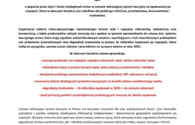Polska Izba Mleka wraz z organizacjami wymienionymi na końcu pisma wystosowała apel o poparcie przez Sejm i