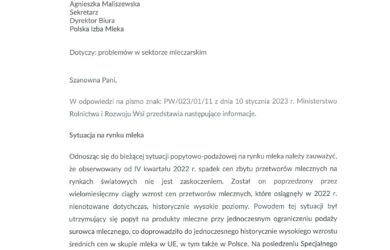 Agnieszka Maliszewska, Dyrektor Polskiej Izby Mleka w dniu 30 stycznia br. w imieniu polskiego sektora mleczarskiego zwróciła