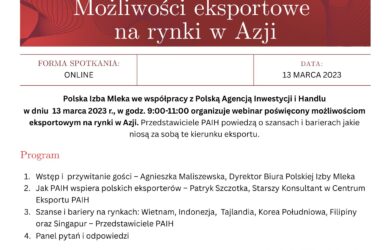 Polska Izba Mleka we współpracy z Polską Agencją Inwestycji i Handlu w dniu 13 marca 2023 r.,