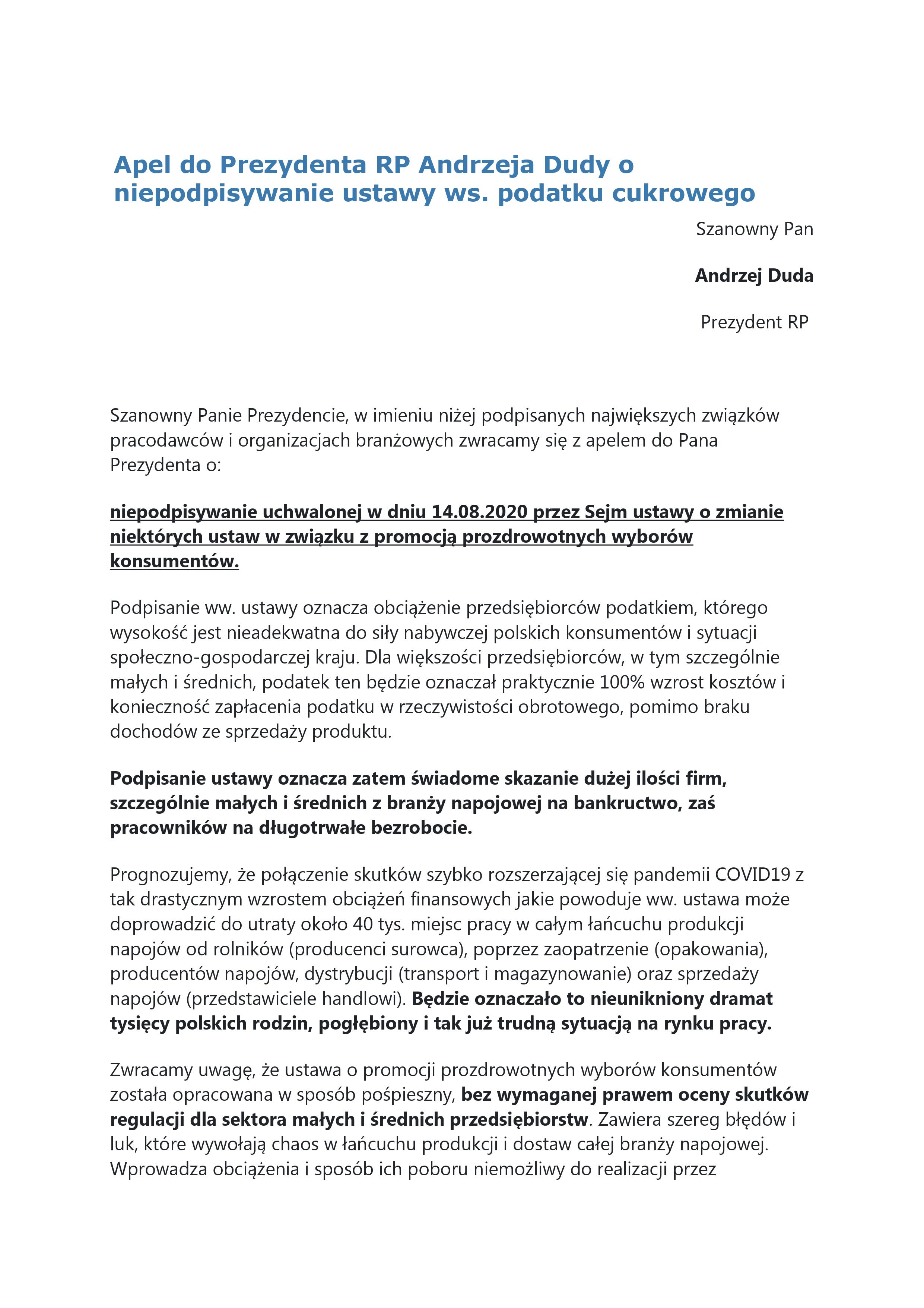 Apel do Prezydenta RP Andrzeja Dudy o niepodpisywanie ustawy ws. podatku cukrowego