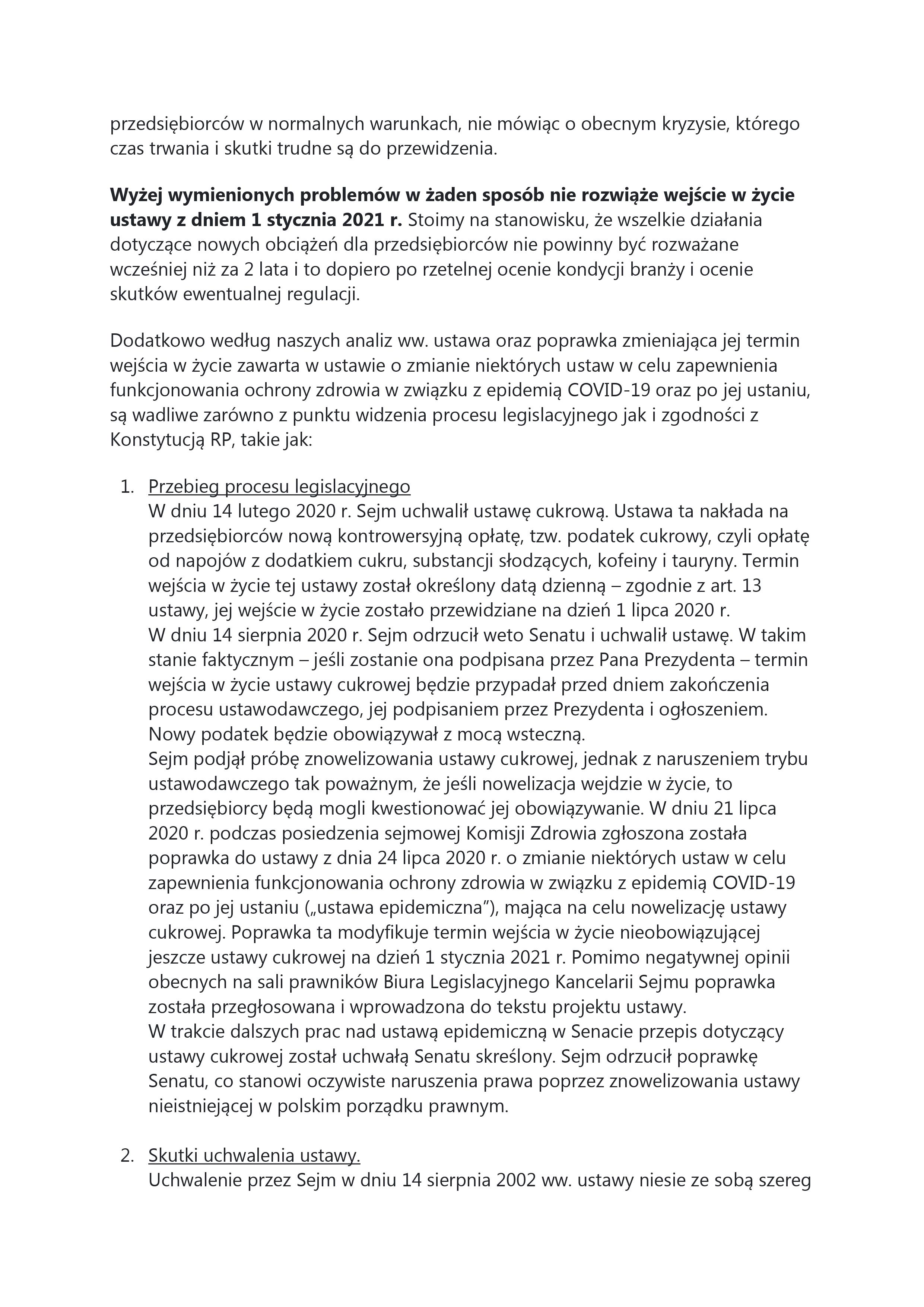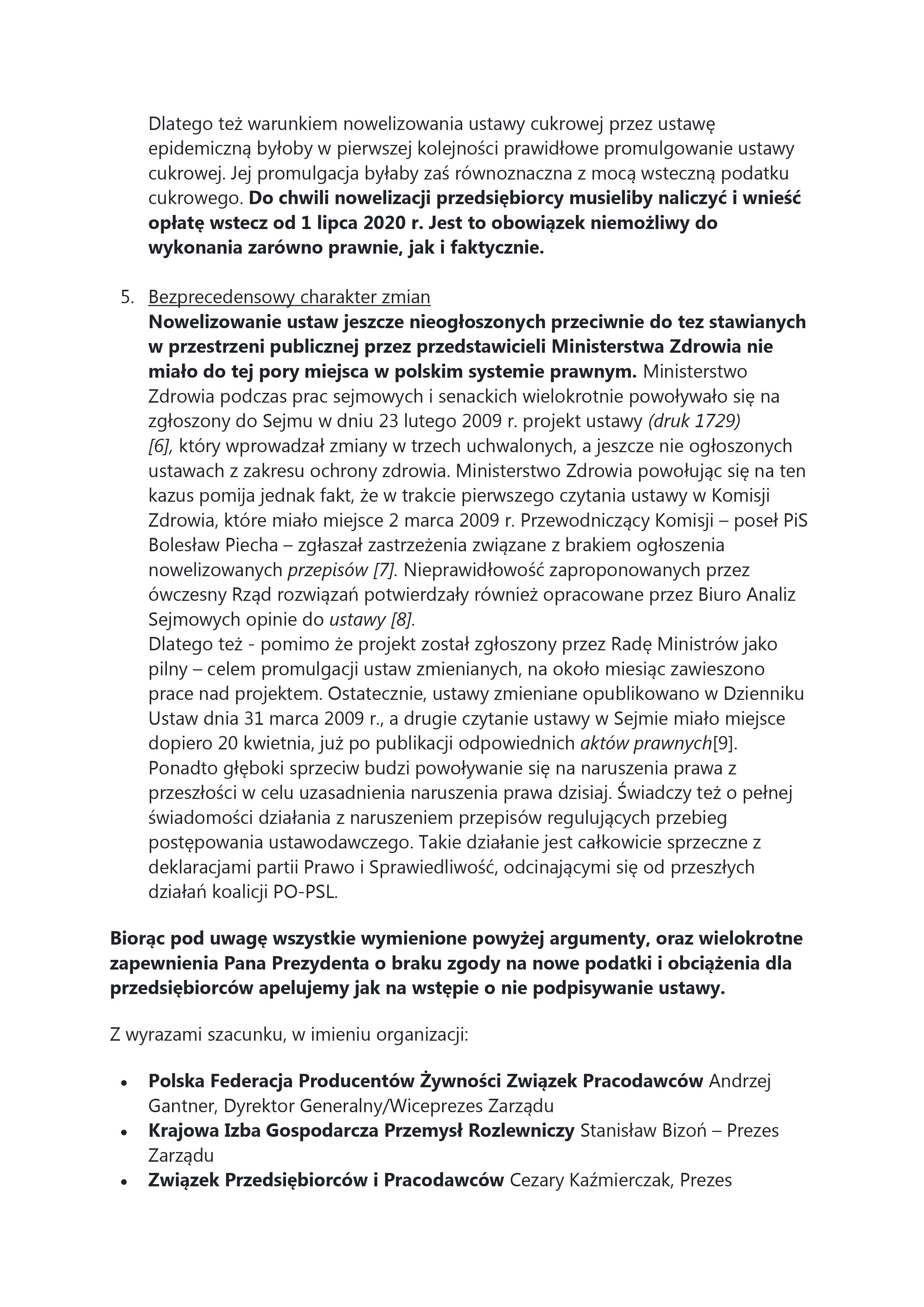 Informujemy, że w związku z uchwaleniem w dniu 14 sierpnia 2020 roku przez Sejm RP ustawy o zmianie niektórych ustaw w związku z promocją prozdrowotnych wyrobów konsumenckich organizacje branżowe wystąpiły z apelem do Prezydenta RP o niepodpisywanie uchwalonej ustawy. Apel jest kontynuacją działań organizacji branżowych zapoczątkowanych w 2019 roku z pojawieniem się zagadnienia wprowadzenia tzw. podatku cukrowego.