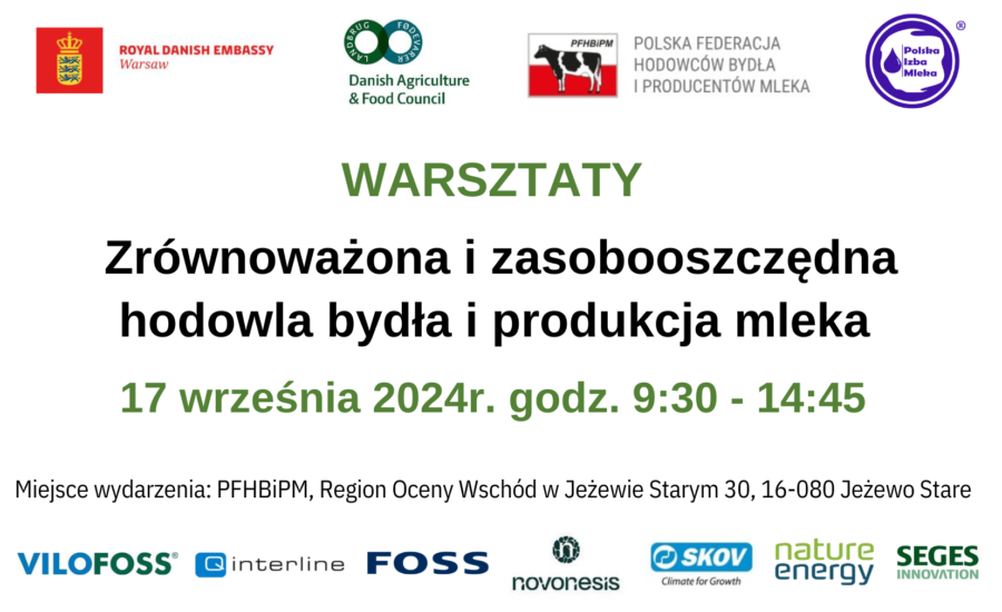 W imieniu Polskiej Izby Mleka, Ambasady Królestwa Danii oraz Polskiej Federacji Hodowców Bydła i Producentów Mleka mamy zaszczy zaprosić Państwa na warsztaty „Zrównoważona i zasobooszczędna hodowla bydła i produkcja mleka” Warsztaty odbędą się