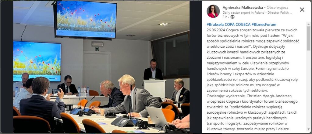 Forum Biznesu pod hasłem „W jaki sposób spółdzielnie rolne gwarantują odporność sektorów zbóż i nasion?” odbyło się 26 czerwca w Brukseli. Forum zgromadziło liderów branży i ekspertów w dziedzinie spółdzielczości rolniczej, aby podkreślić kluczową rolę, jaką spółdzielnie rolnicze muszą odegrać w zapewnieniu sukcesu tych sektorów. W spotkaniu wzięła udział Agnieszka Maliszewska – Dyrektor Biura PIM, pierwsza wiceprzewodnicząca COGECA.