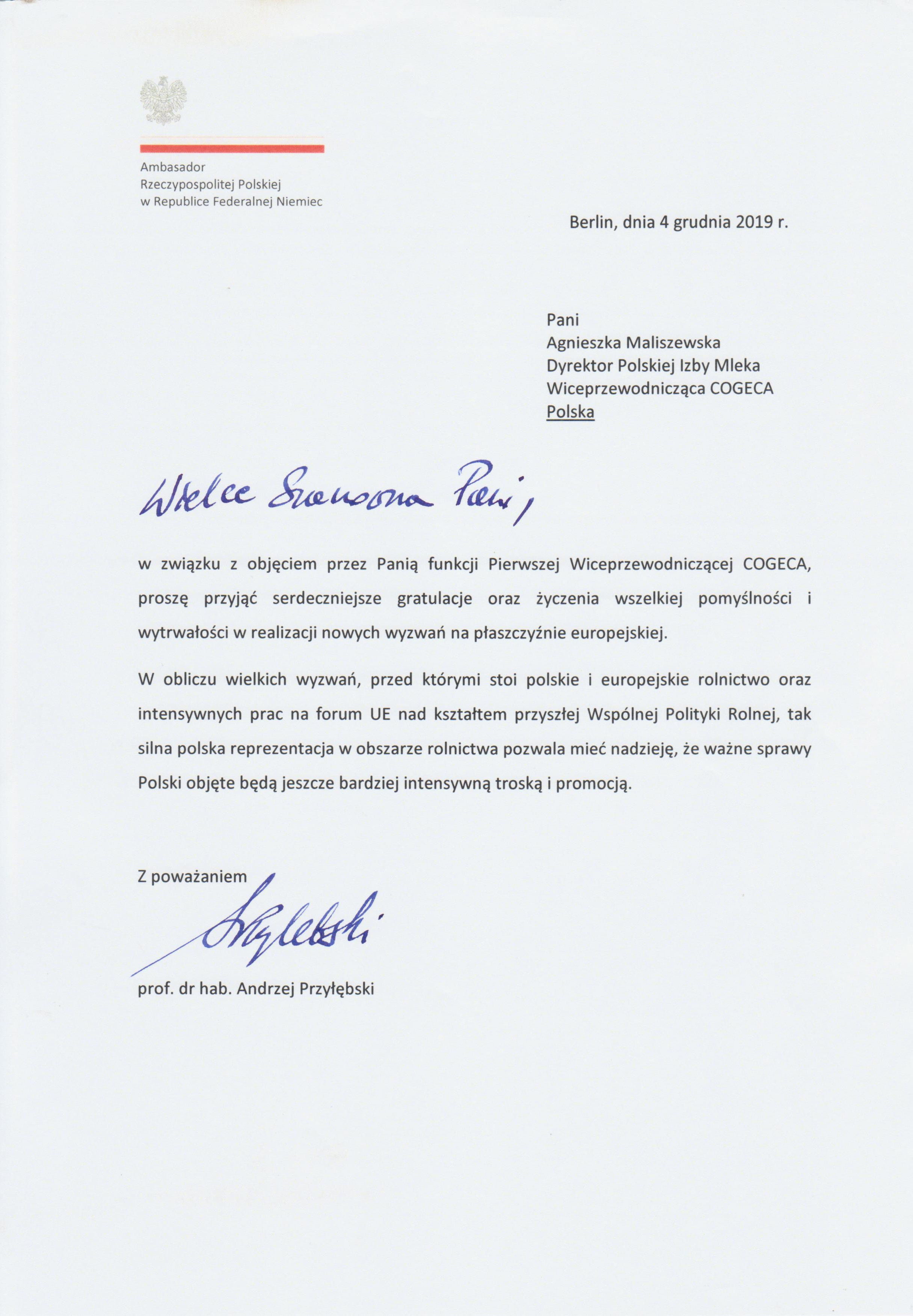 Gratulacje od Pana Ambasadora Rzeczypospolitej Polskiej w Republice Federalnej Niemiec prof. dr. hab. Andrzeja Przyłębskiego dla Pani Agnieszki Maliszewskiej w związku z objęciem funkcji Pierwszej Wiceprzewodniczącej GOGECA