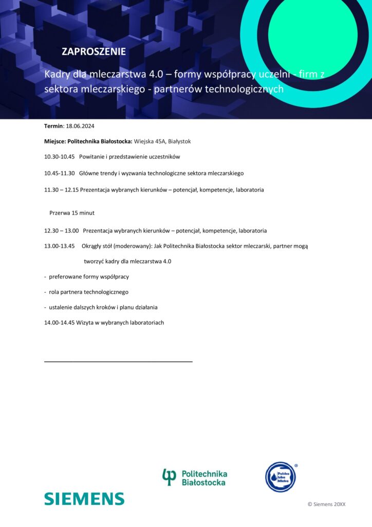 Mając na uwadze postępującą transformację cyfrową i wdrażanie działań na rzecz ESG przez sektor przetwórstwa mleczarskiego oraz związane z tym procesem zapotrzebowanie na specjalistów o innych, niż dotychczas kompetencjach, Polska Izba Mleka razem z Politechnikę Białostocką i firmą Siemens – jako partnera technologicznego podjęła inicjatywę mającą na celu stawienie czoła temu wyzwaniu.