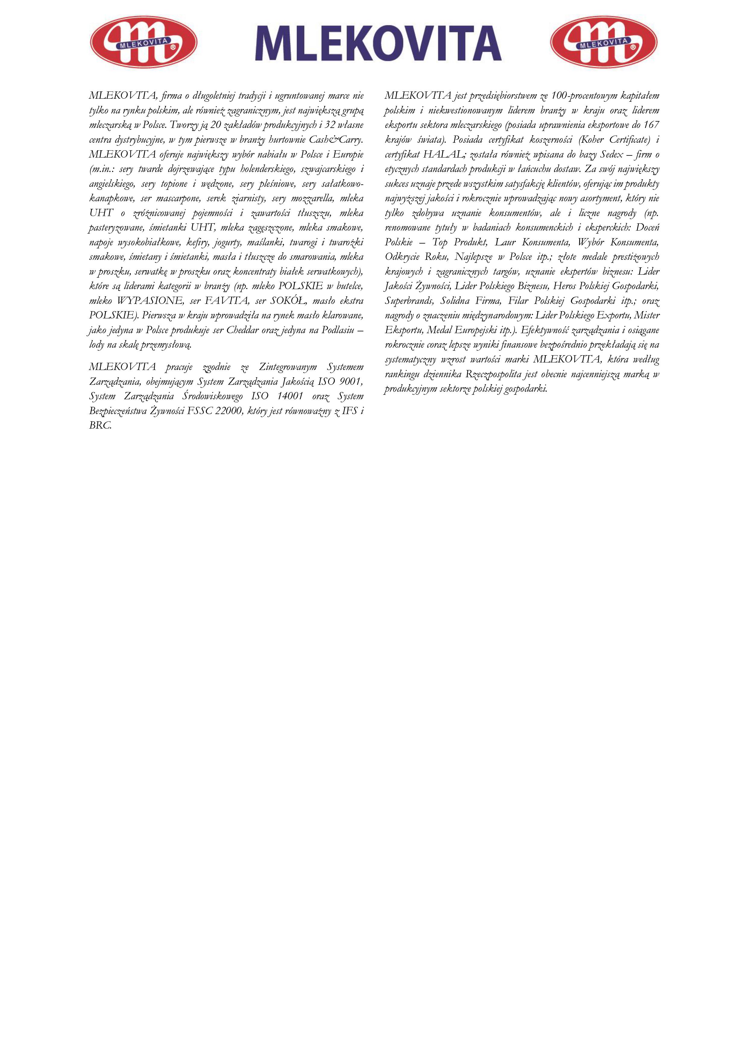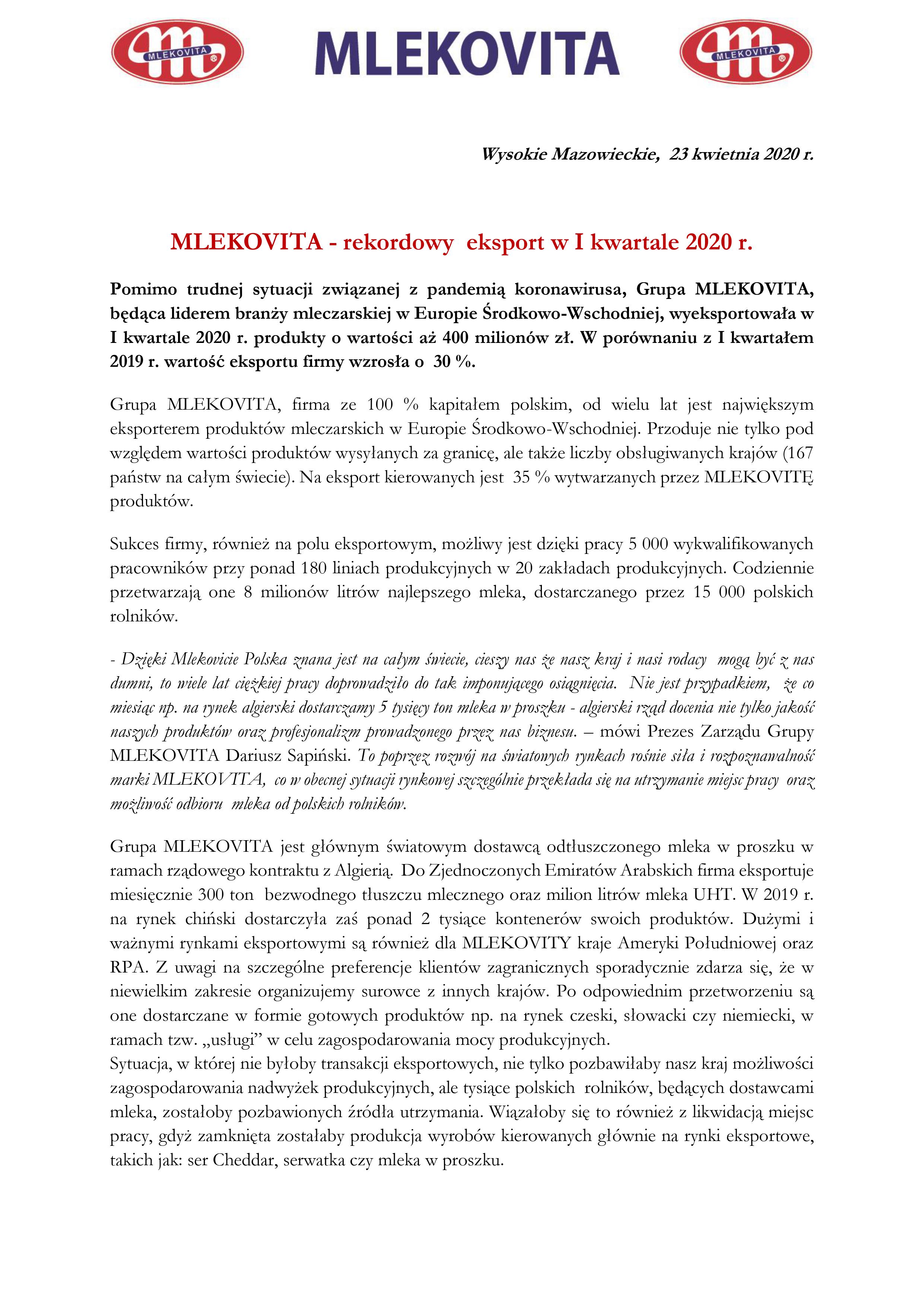 Komunikat firmy MLEKOVITA ws. eksportu – w odniesieniu do listy opublikowanej przez MRiRW