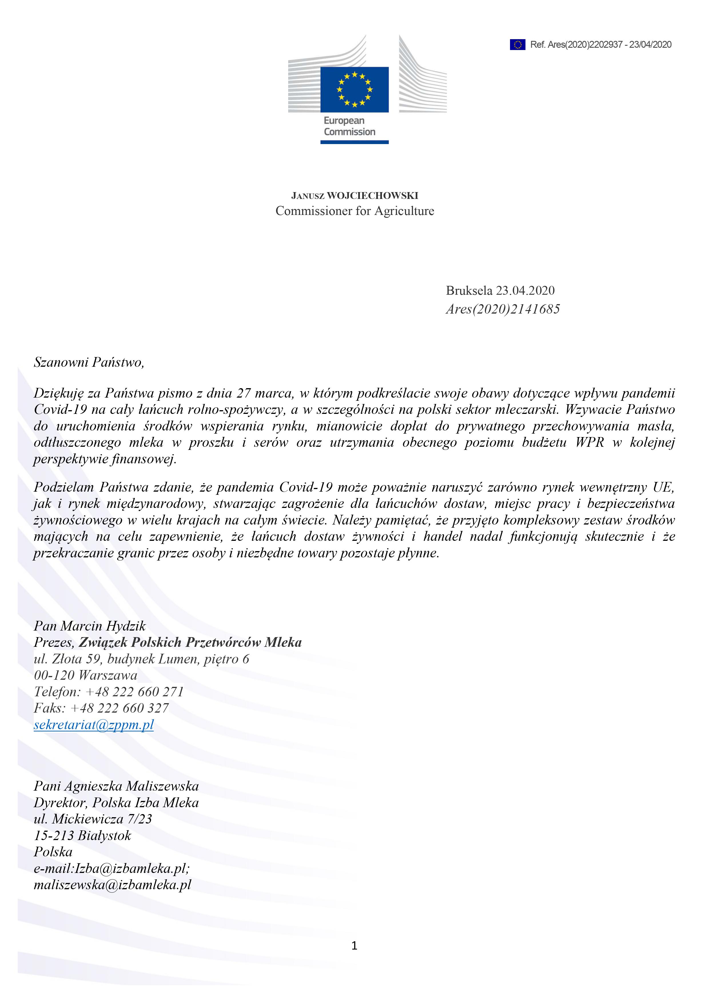 List od Komisarza ds. Rolnictwa Janusza Wojciechowskiego na pismo ws. podjęcie interwencji w zakresie działań antykryzysowych skierowanych do rolników, producentów mleka i spółdzielnie oraz zakłady przetwórcze