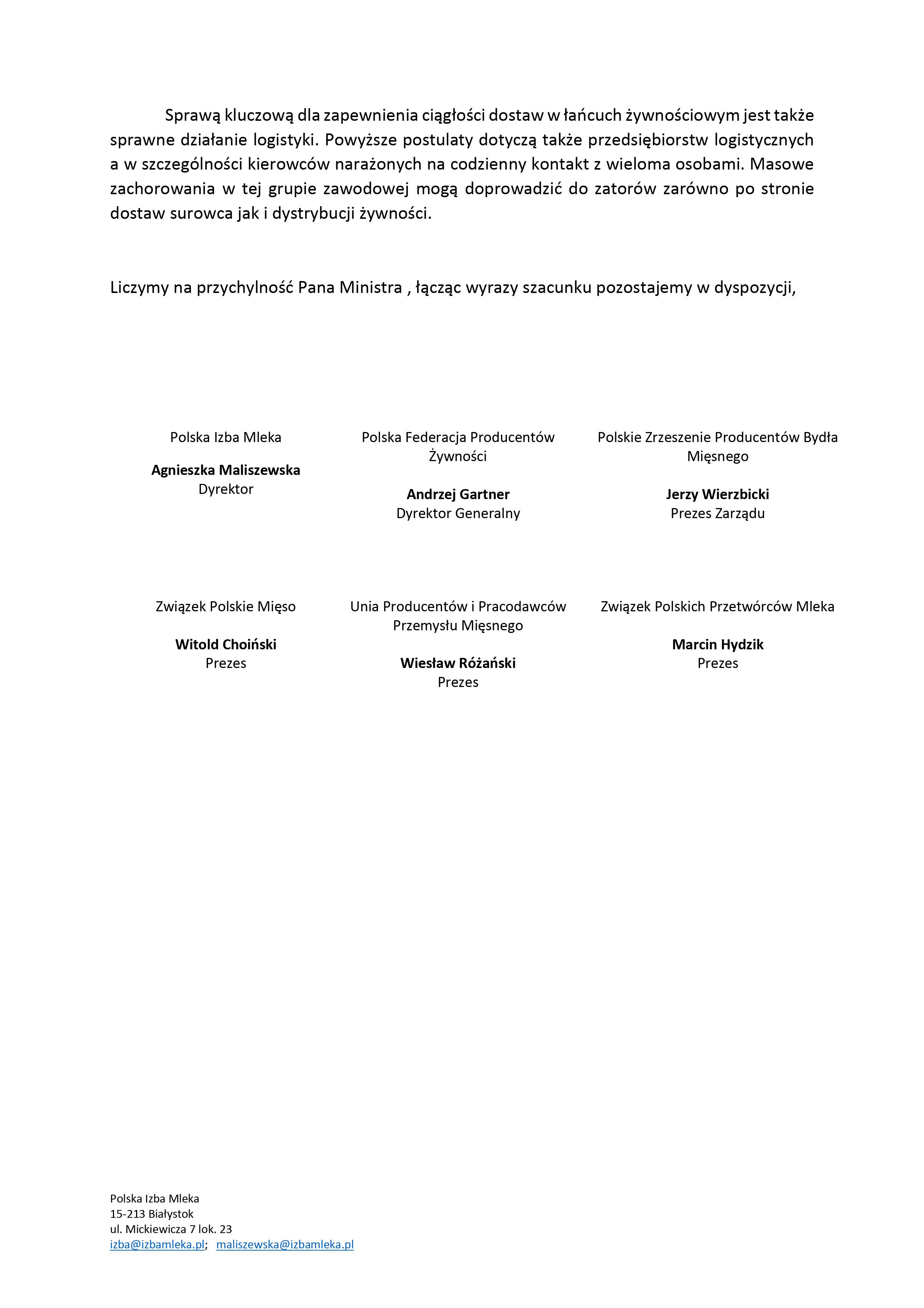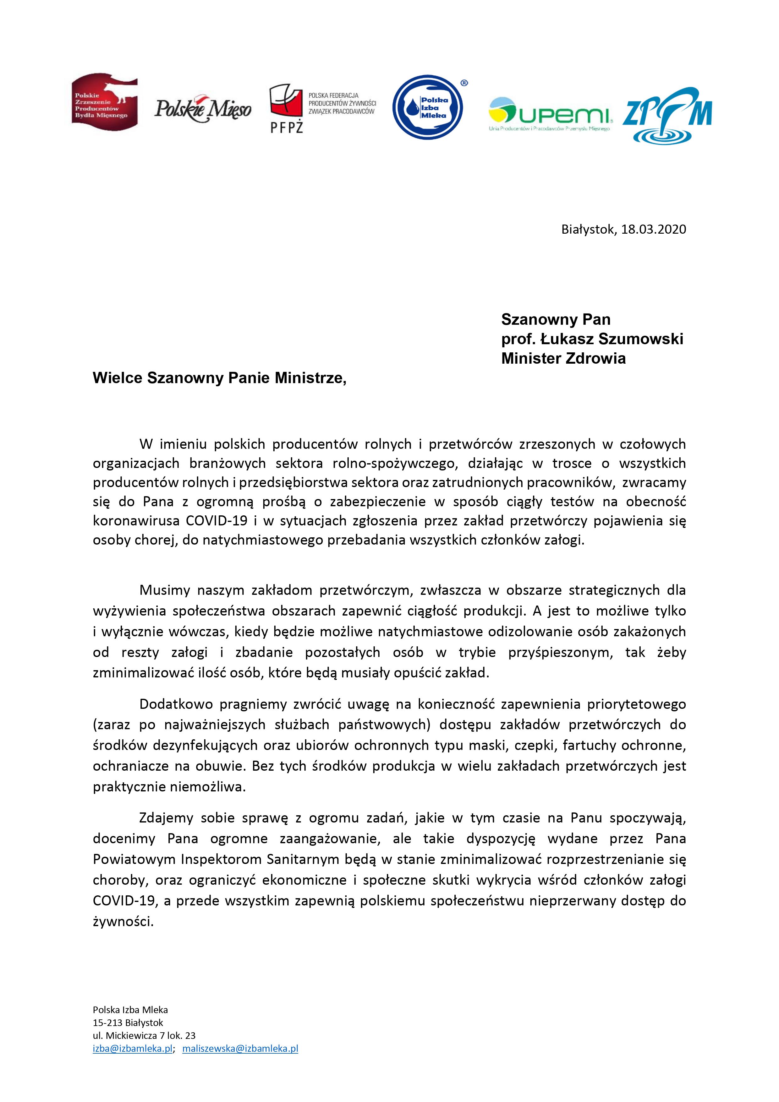 Największe polskie organizacje sektora rolno- spożywczego skierowały pismo do Pana Prof. Łukasza Szumowskiego ws. zapewnienia testów na obecność koronawirusa COVID-19 w przypadku pojawienia się zachorowania w zakładach przetwórstwa spożywczego
