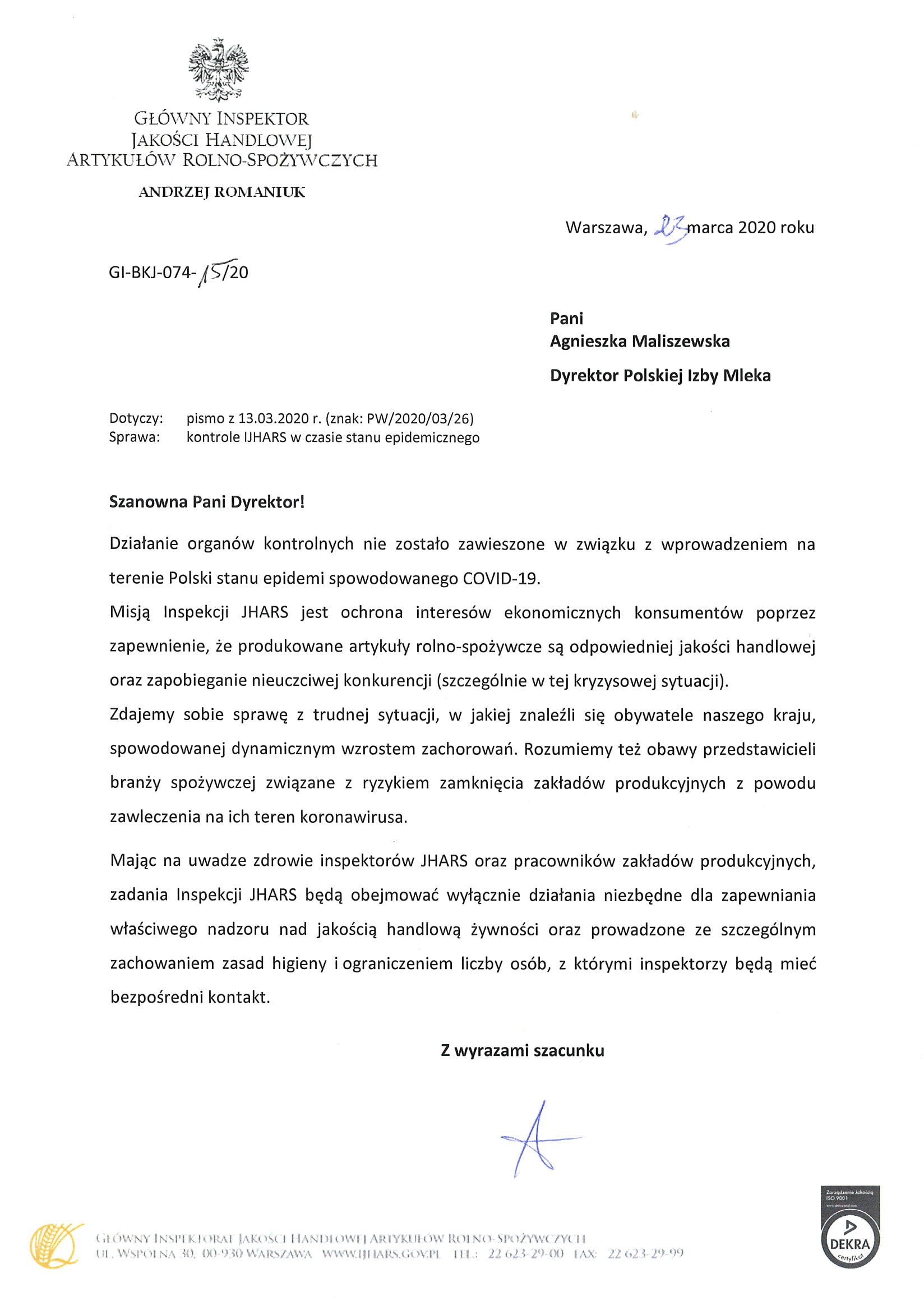 Odpowiedź Głównego Inspektoratu Jakości Handlowej Artykułów Rolno-Spożywczych na pismo Polskiej Izby Mleka w sprawie wstrzymania kontroli w zakładach w związku z epidemią koronawirusa