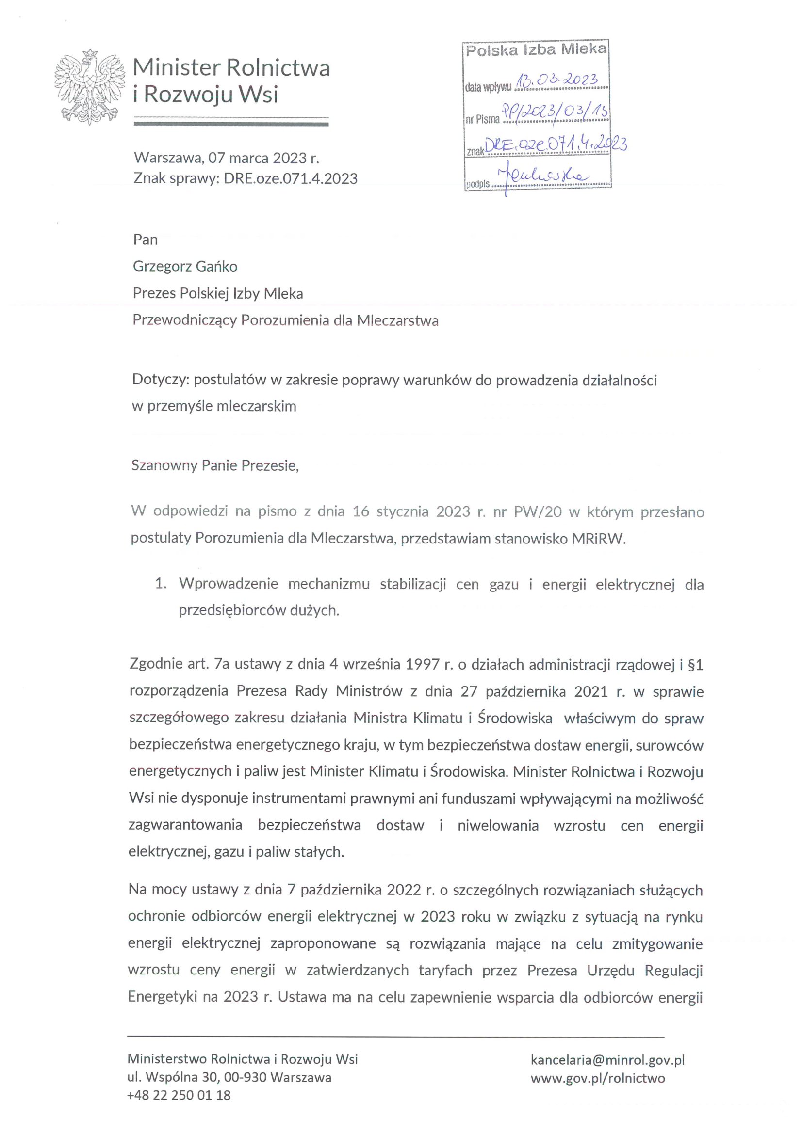 Odpowiedź Ministerstwa Rolnictwa i Rozwoju Wsi na postulaty w zakresie poprawy warunków do prowadzenia działalności w przemyśle mleczarskim