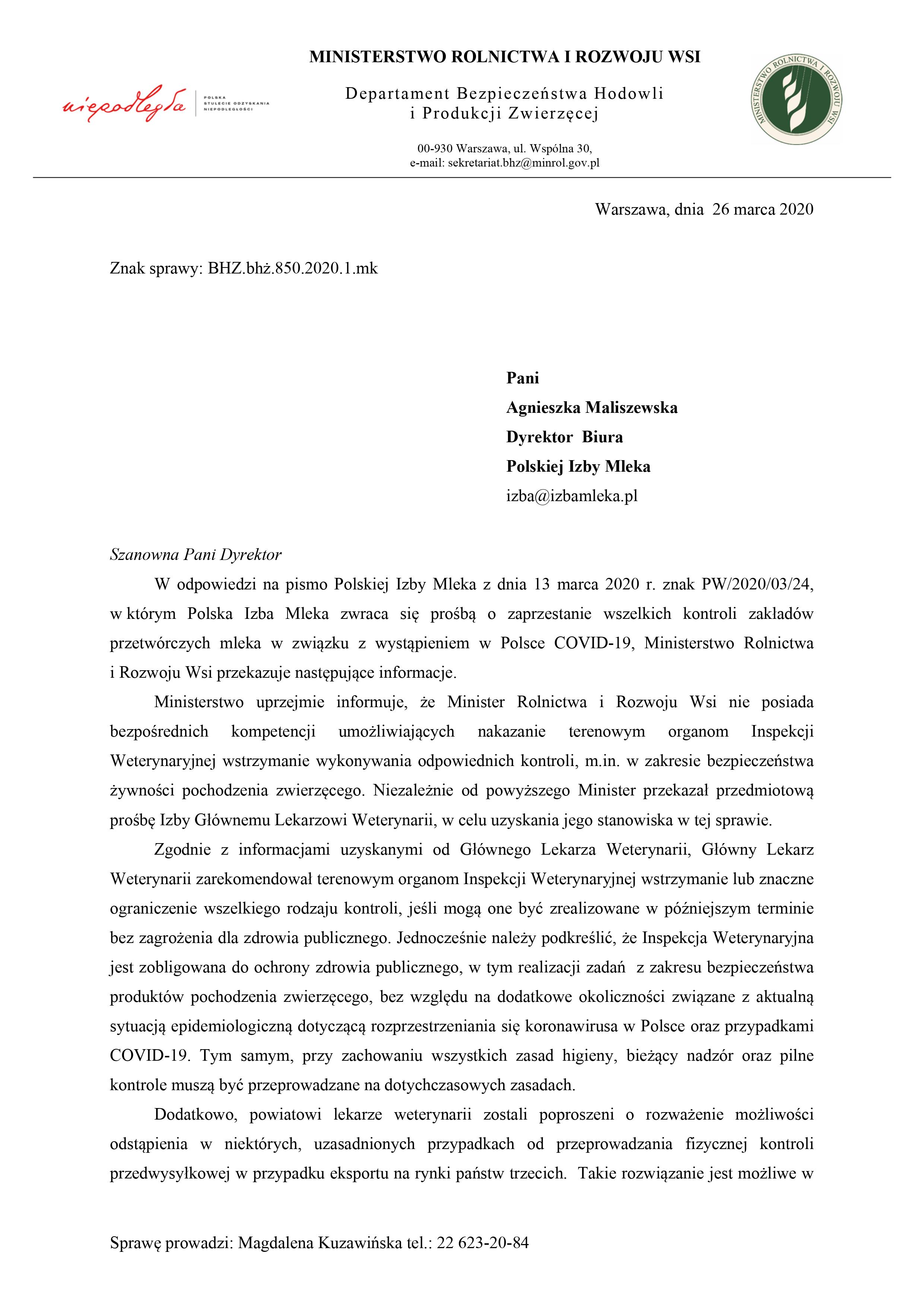 Do Biura Polskiej Izby Mleka wpłynęła odpowiedź Ministerstwa Rolnictwa i Rozwoju Wsi na pismo Polskiej Izby Mleka dot. o zaprzestaniz wszelkich kontroli zakładów przetwórczych mleka w związku z wystąpieniem w Polsce COVID-19.