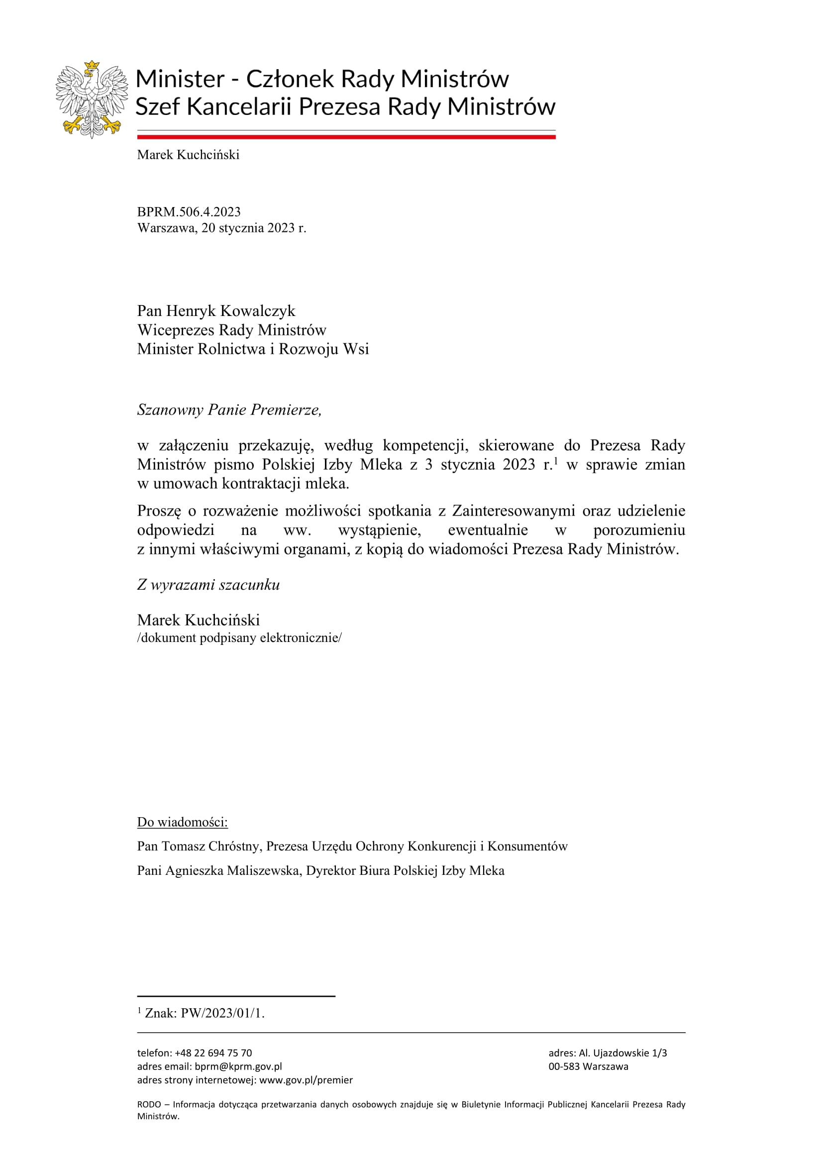 Polska Izba Mleka działając na rzecz sektora mleczarskiego, 3 stycznia skierowała pismo do Prezesa Rady Ministrów Mateusza Morawieckiego w sprawie ustawy o przeciwdziałaniu nieuczciwemu wykorzystaniu przewagi kontraktowej w obrocie produktami rolnymi i spożywczymi zwracając się z prośbą o wspólne przedyskutowanie sytuacji kryzysowej przez nią wywołanej oraz o przeanalizowanie interpretacji przez strony umów kwestii wrażliwych. Poniżej pismo Ministra- Członka Rady Ministrów, Szefa Kancelarii Prezesa Rady Ministrów skierowane do Wiceprezesa Rady Ministrów, Ministra Rolnictwa i Rozwoju Wsi Henryka Kowalczyka.