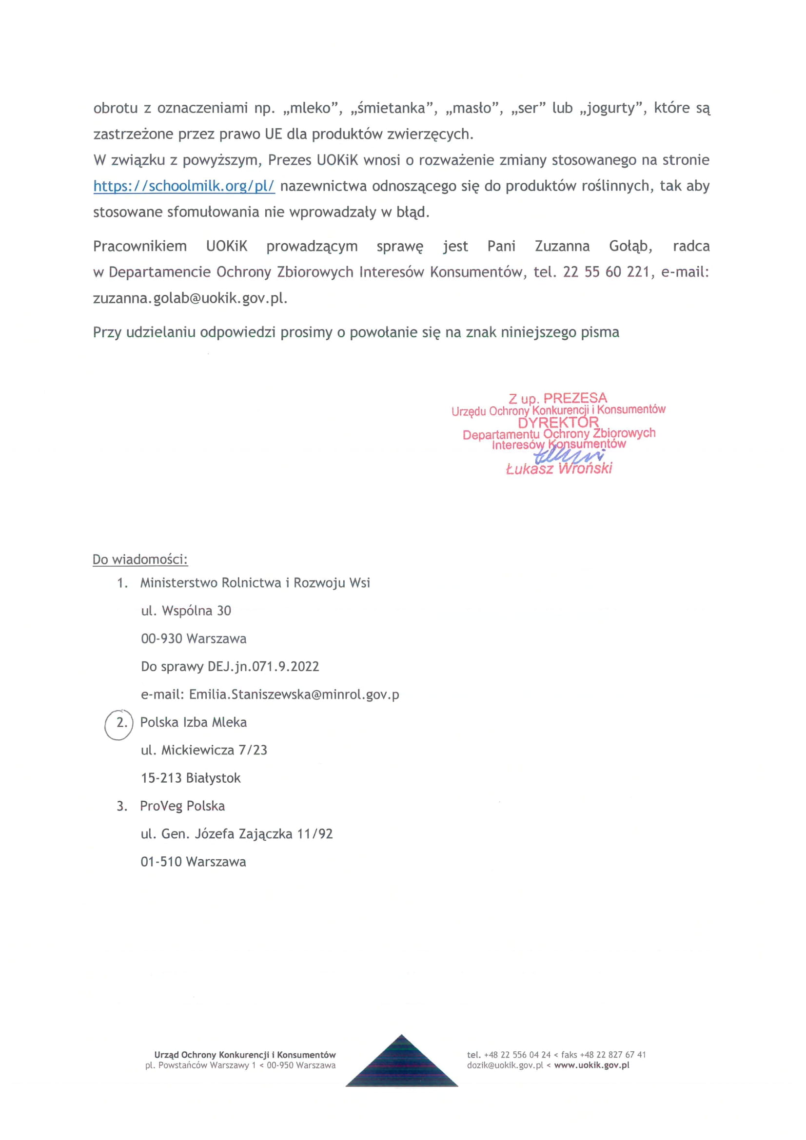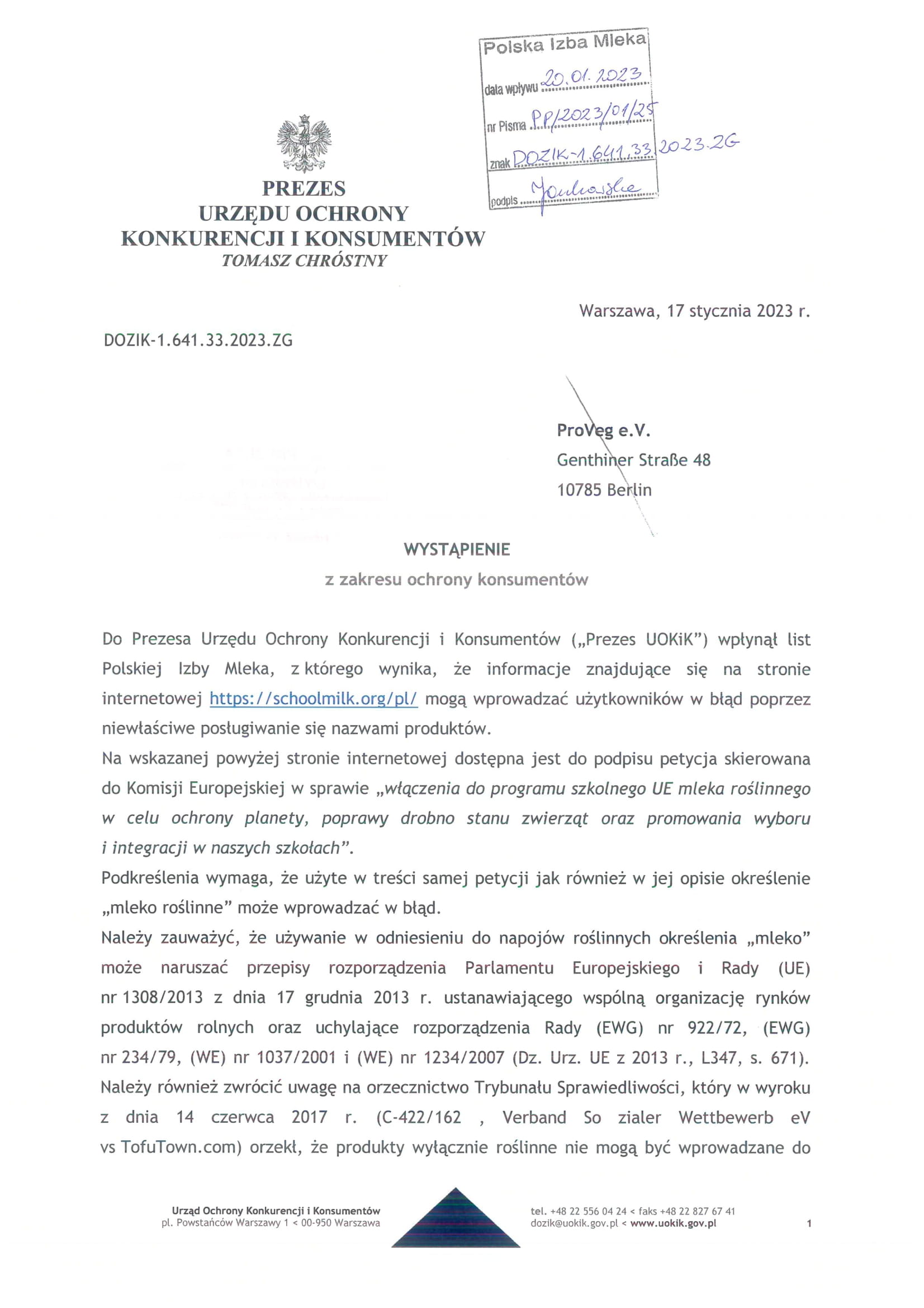 Polska Izba Mleka działając na rzecz sektora mleczarskiego, w ubiegłym roku skierowała pismo do Prezesa Urzędu Ochrony Konkurencji i Konsumentów w sprawie wprowadzania konsumentów w błąd przez ProVeg International. Poniżej odpowiedź UOKiK.