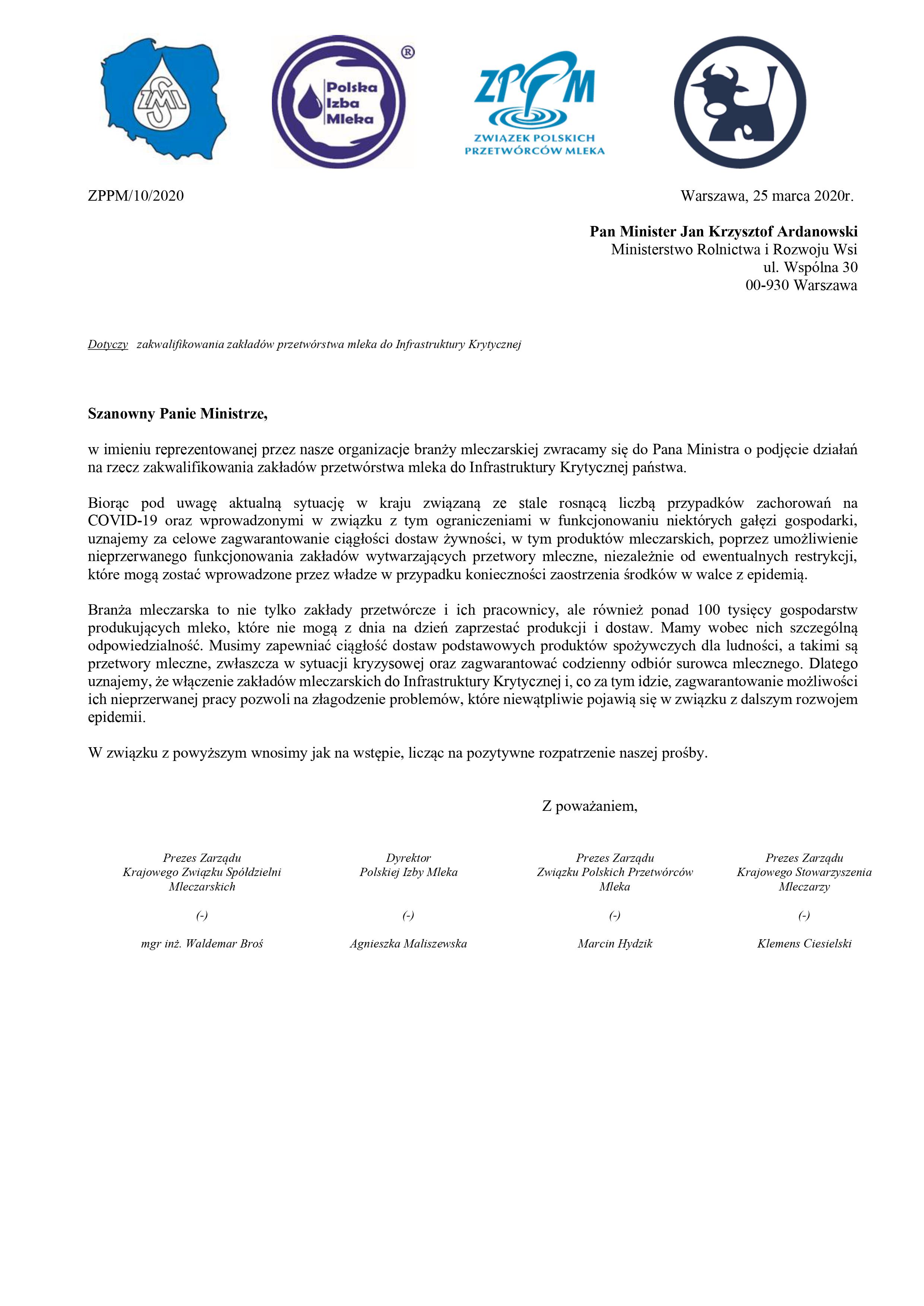 Cztery organizacje branży mleczarskiej tj.Krajowy Związek Spółdzielni Mleczarskich, Polska Izba Mleka, Związek Polskich Przetwórców Mleka oraz Krajowe Stowarzyszenie Mleczarzy skierowały pismo do Pana J.K. Ardanowskiego, Ministra Rolnictwa i Rozwoju Wsi, w sprawie zakwalifikowania zakładów przetwórstwa mleka do Infrastruktury Krytycznej.