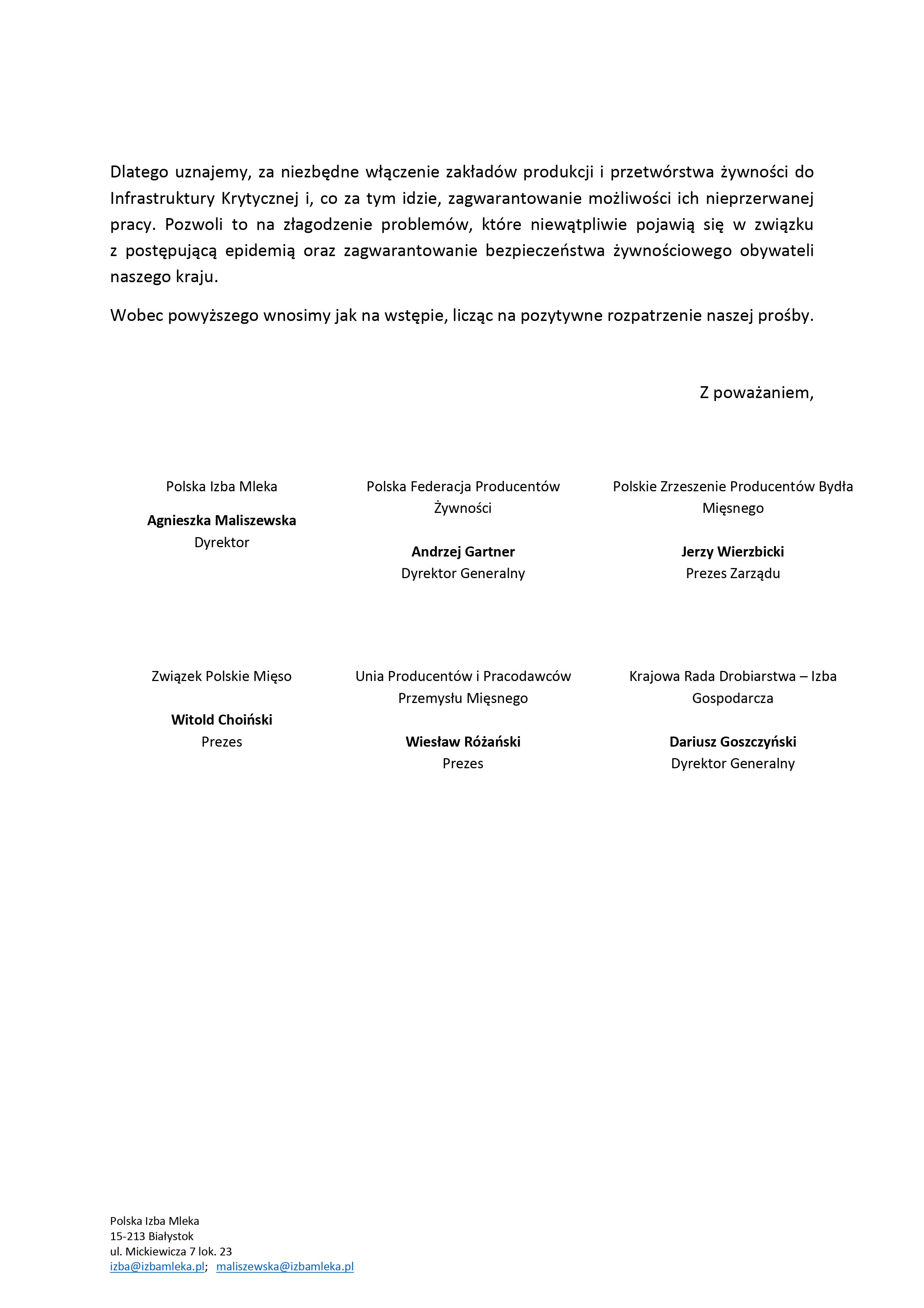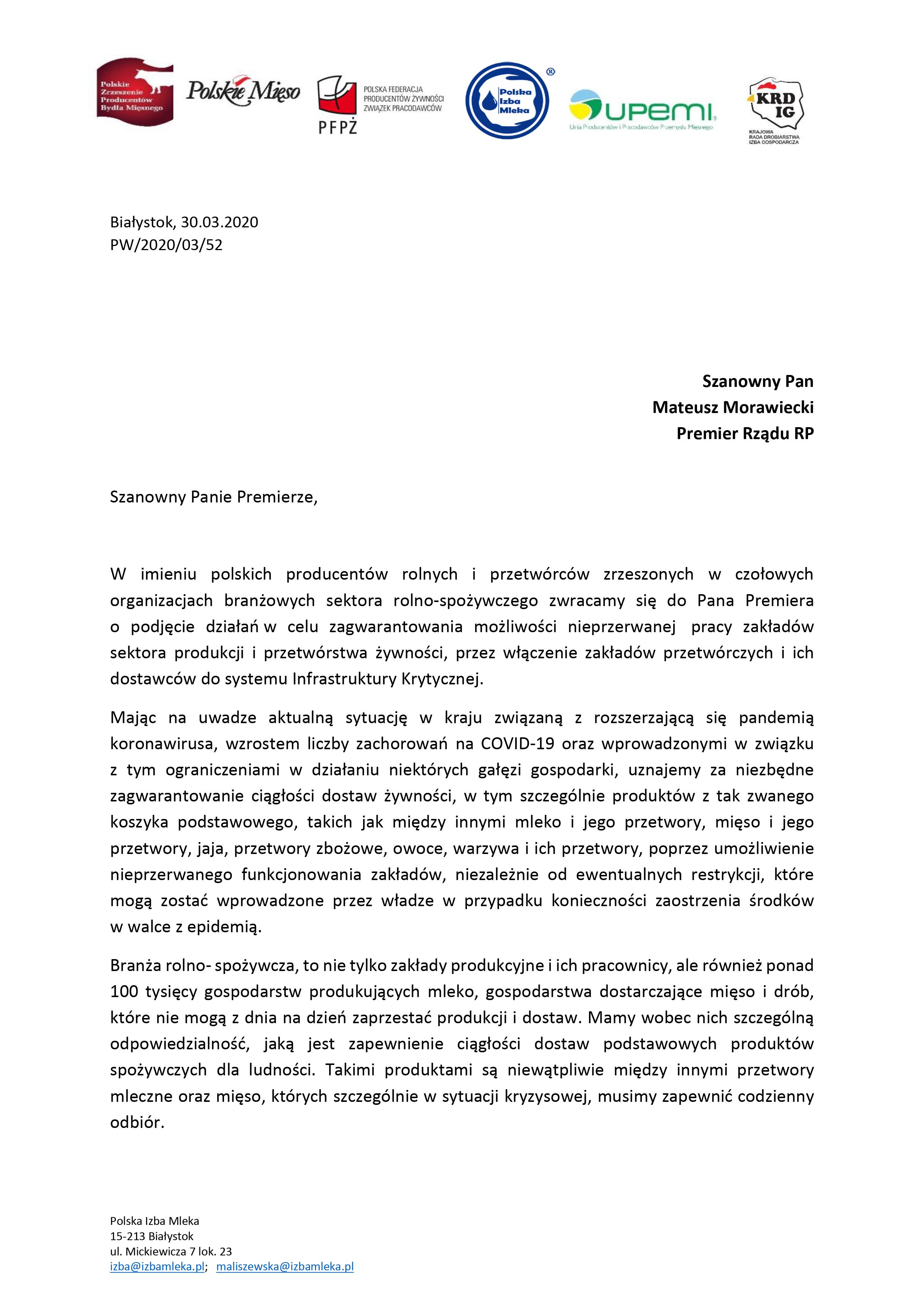Sześć organizacji sektora produkcji i przetwórstwa żywności skierowały pismo do Premiera Morawieckiego o niezwłoczne podjęcie działań zmierzających do włączenia naszych zakładów przetwórczych do Infrastruktury Krytycznej, co zapewni naszych zakładom i ich dostawcom ciągłość produkcji.