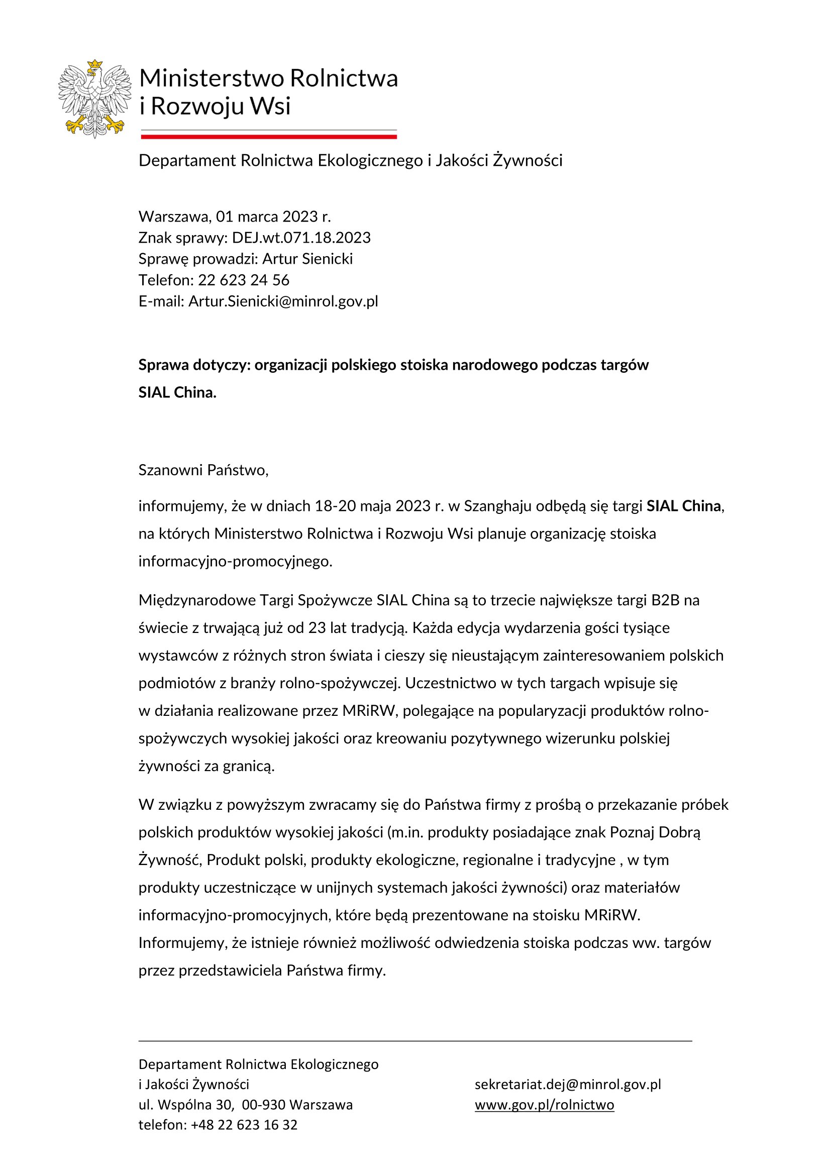 Organizacji polskiego stoiska narodowego podczas targów SIAL China przez Ministerstwo Rolnictwa i Rozwoju Wsi