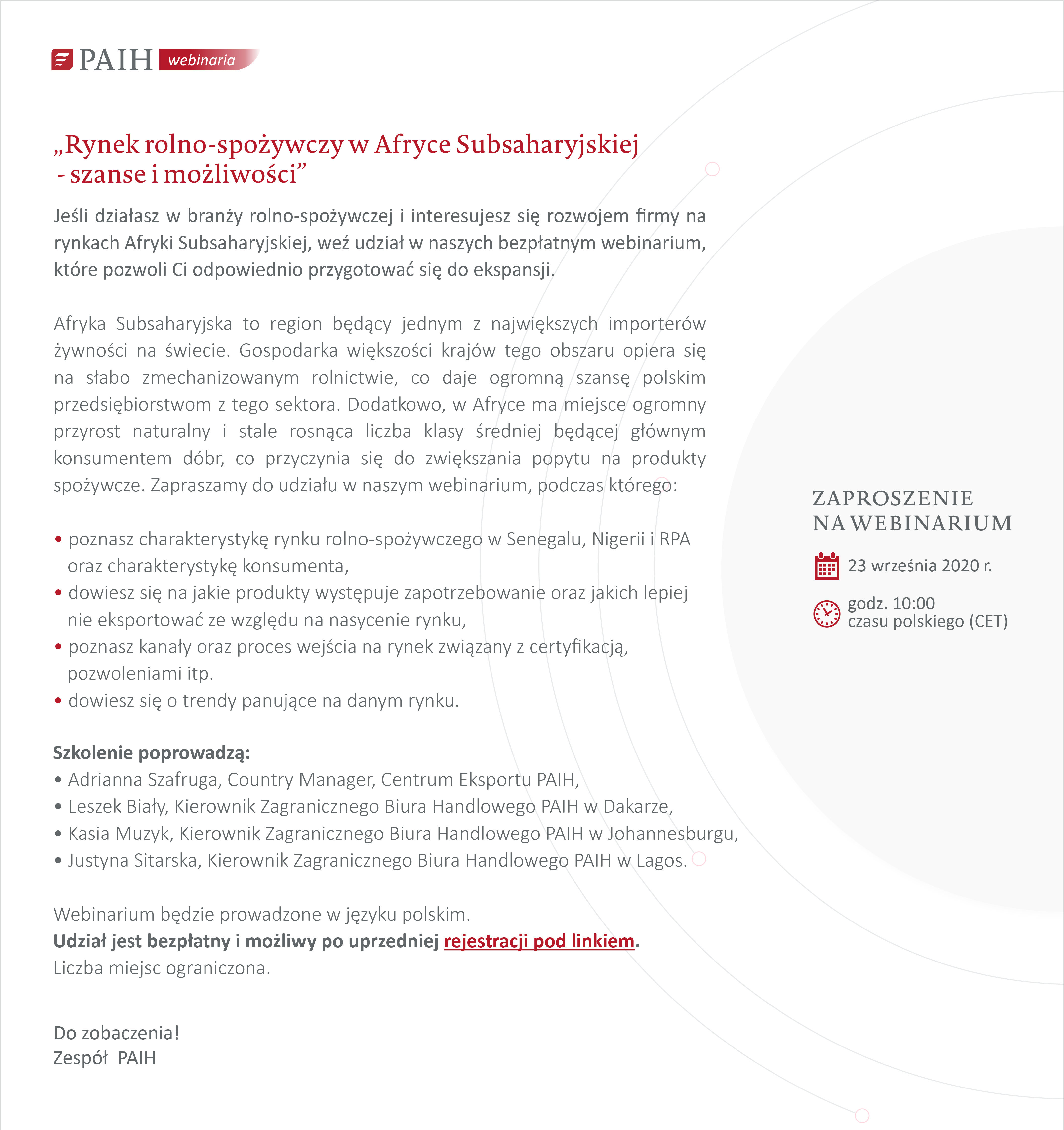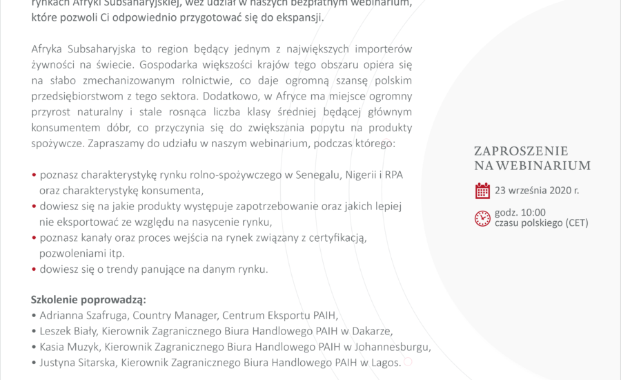 Webinarium odbędzie się 23 września o godz. 10.00. Udział jest bezpłatny i możliwy po wcześniejszej rejestracji pod linkiem: https://www.paih.gov.pl/20200923/webinarium_rynek_rolno_spozywczy_afryka_subsaharyjska