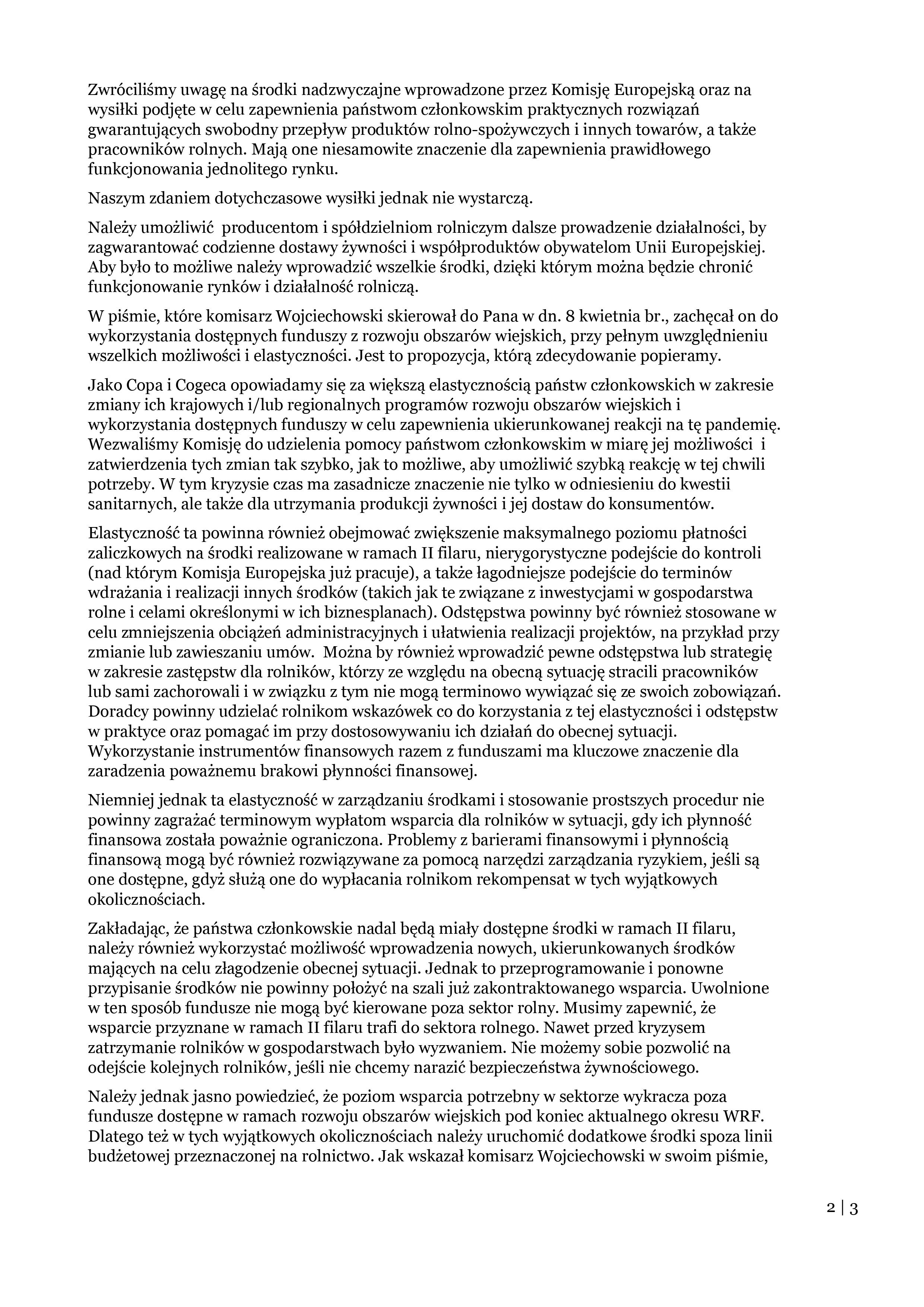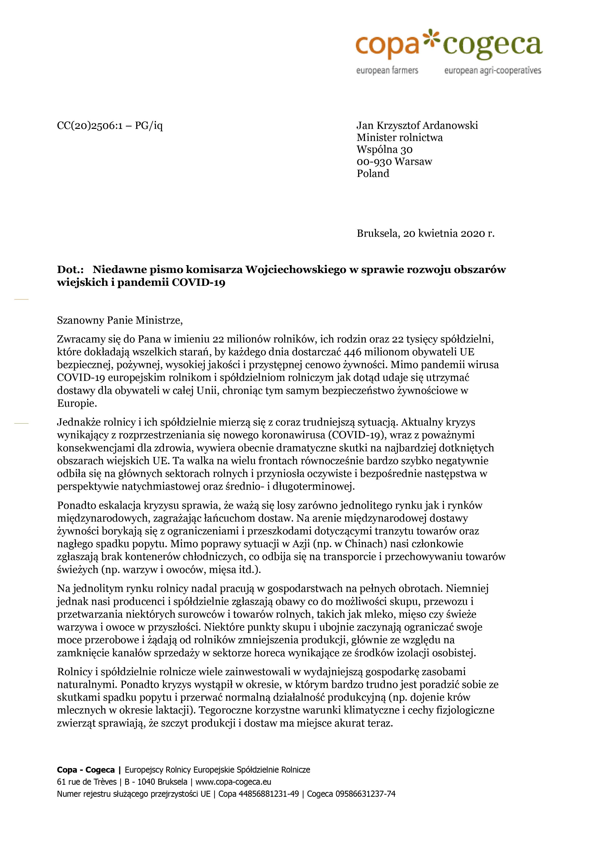 Pismo Copa Cogeca do MRiRW dot. niedawnego pisma komisarza Wojciechowskiego w sprawie obszarów wiejskich i pandemii COVID-19