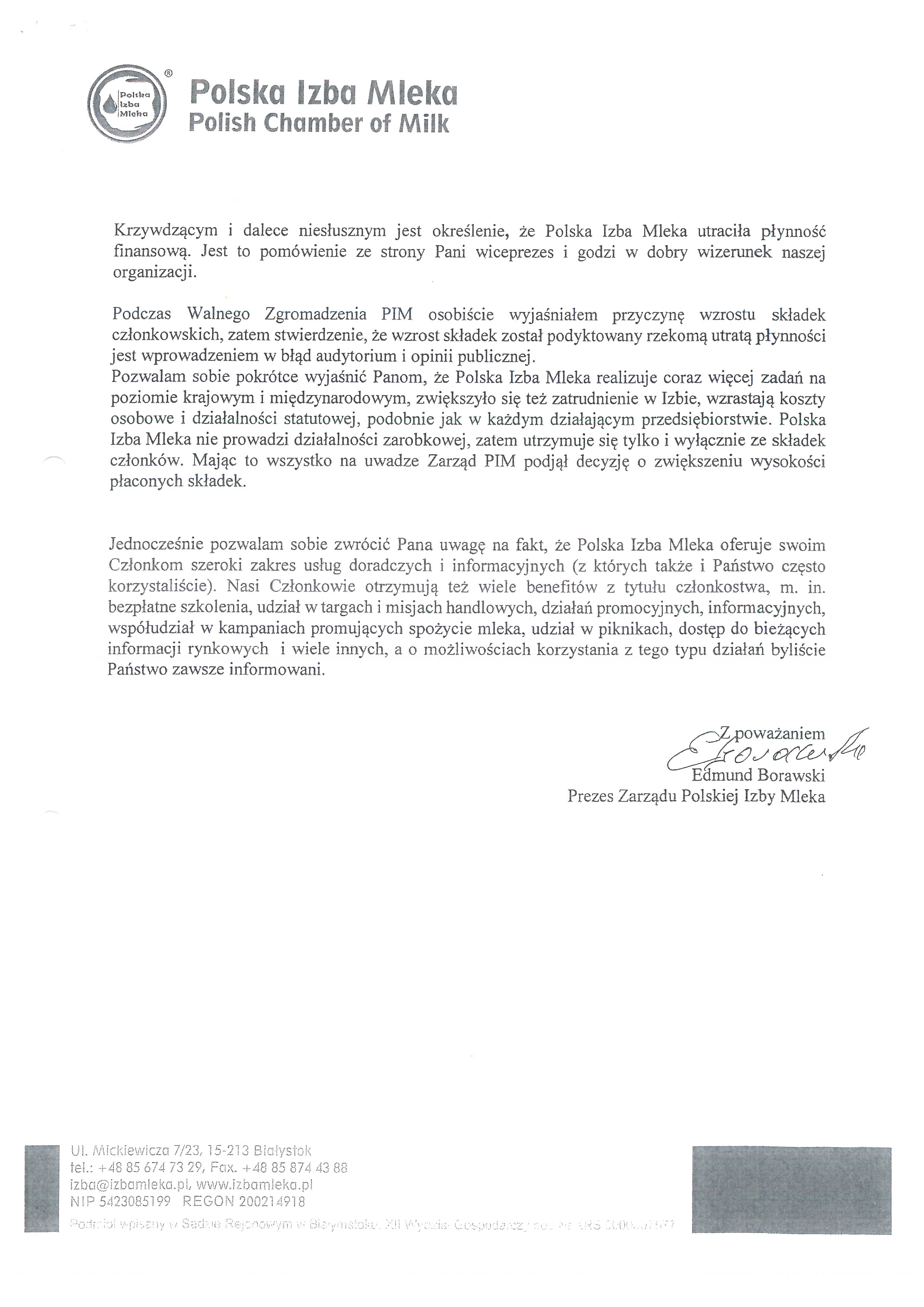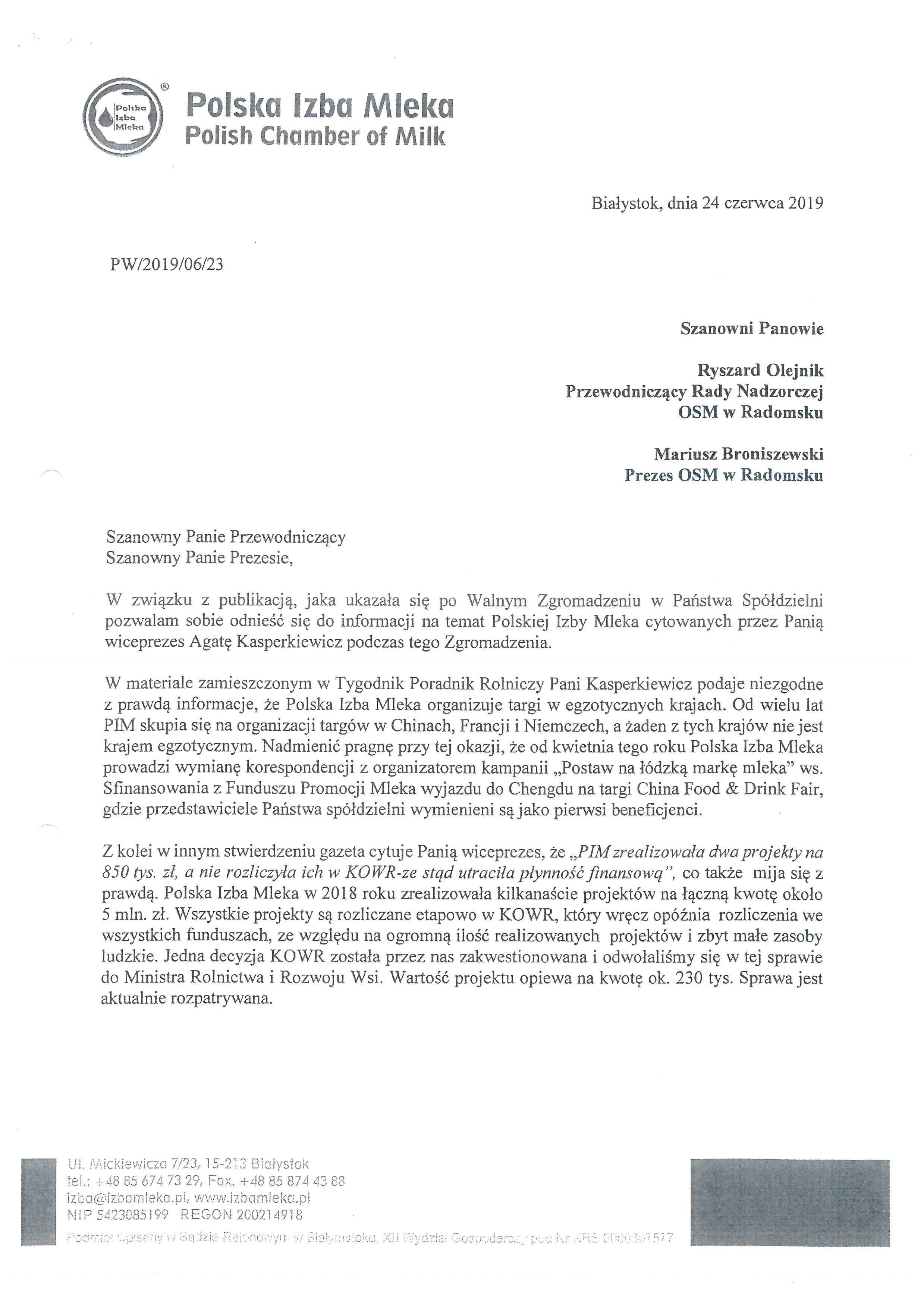 Pismo dot. stanowiska PIM ws. wypowiedzi OSM w Radomsku