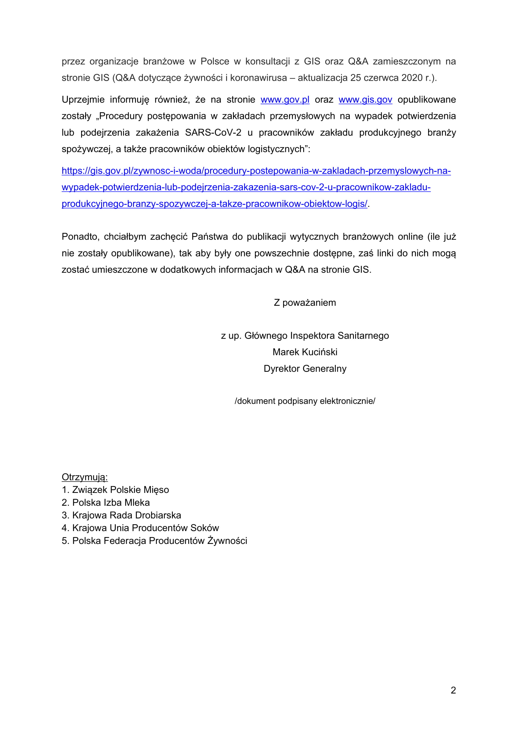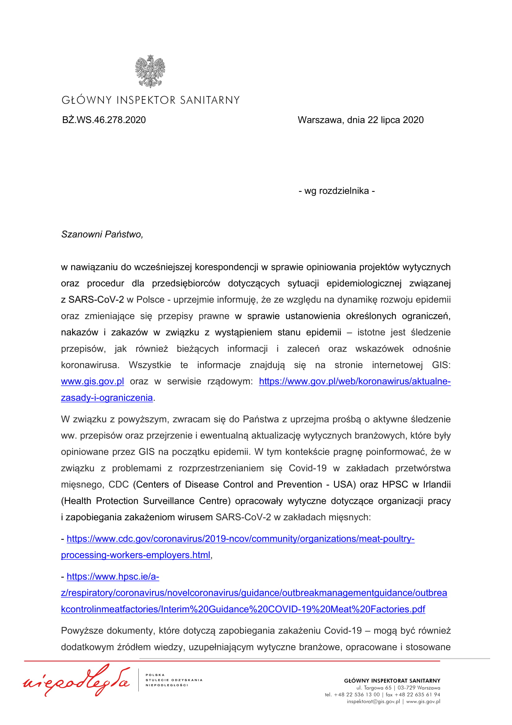Do Biura Polskiej Izby Mleka wpłynęło pismo Głównego Inspektora Sanitarnego znak: BŻ.WS.46.278.2020 z dnia 22 lipca 2020 r. w sprawie aktualizacji wytycznych i procedur dla przedsiębiorców dot. sytuacji epidemiologicznej związanej z SARS-CoV-2 w Polsce.