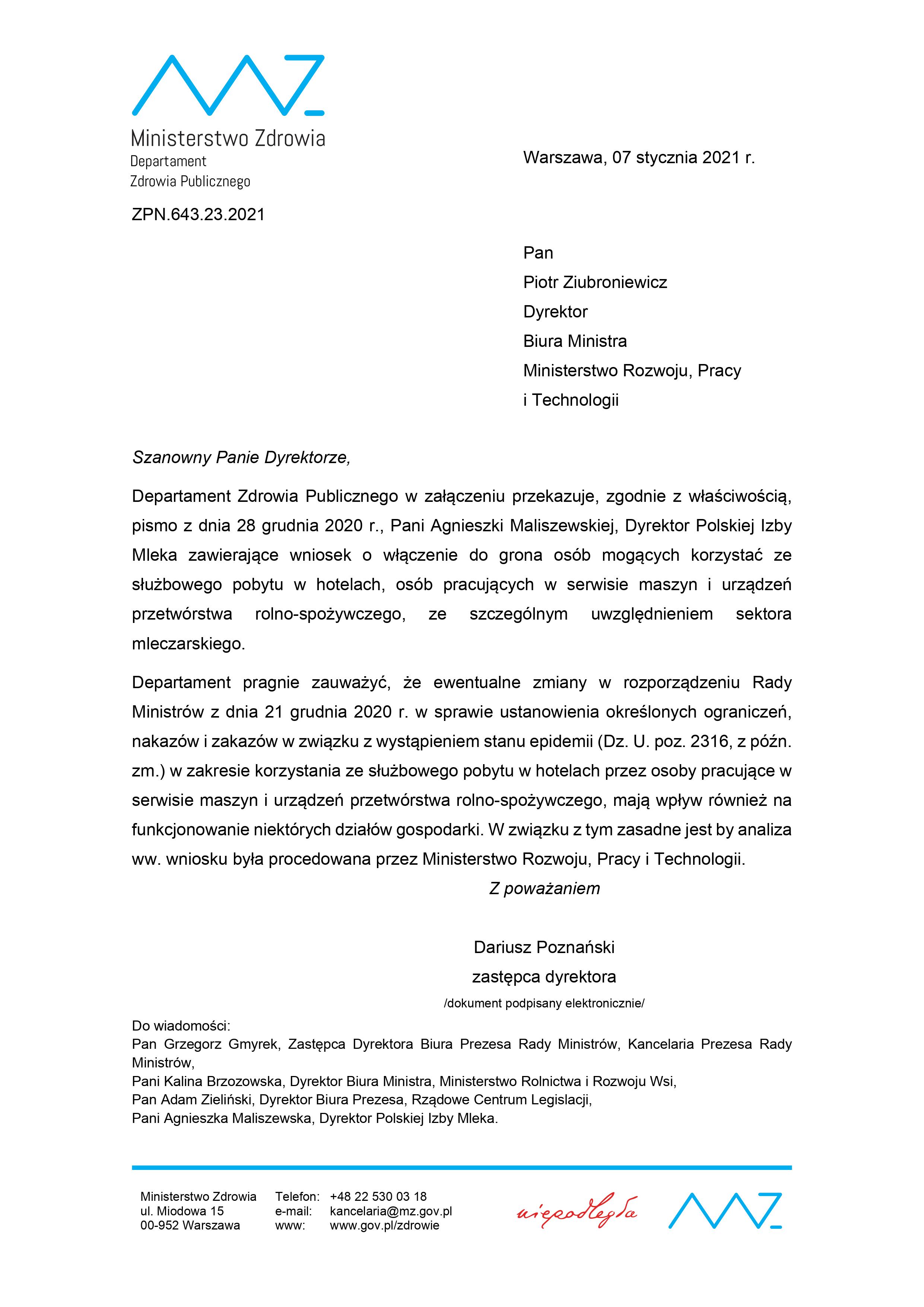 Poniżej przekazujemy pismo z Ministerstwa Zdrowia zawierające wniosek o włączenie do grona osób mogących korzystać ze służbowego pobytu w hotelach, osób pracujących w serwisach maszyn i urządzeń przetwórstwa rolno-spożywczego, ze szczególnym uwzględnieniem sektora mleczarskiego.