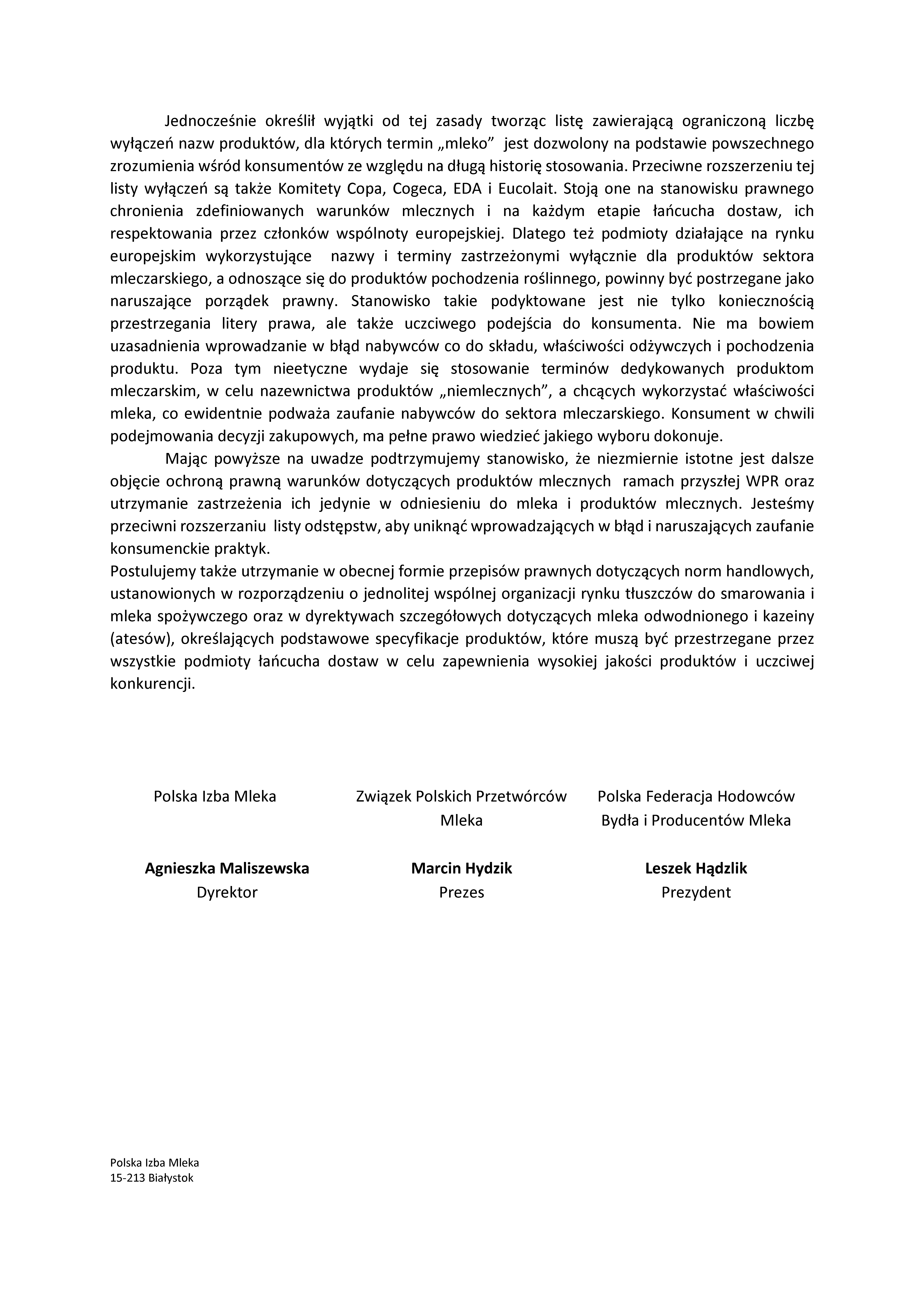 Pismo skierowane przez trzy organizacje do Ministra Rolnictwa i Rozwoju Wsi w sprawie poprawek do rozporządzenia zmieniającego rozporządzenie (UE) nr 1308/2013 dotyczącego ochrony nazewnictwa dotyczącego przetworów mlecznych oraz produktów zawierających mięso