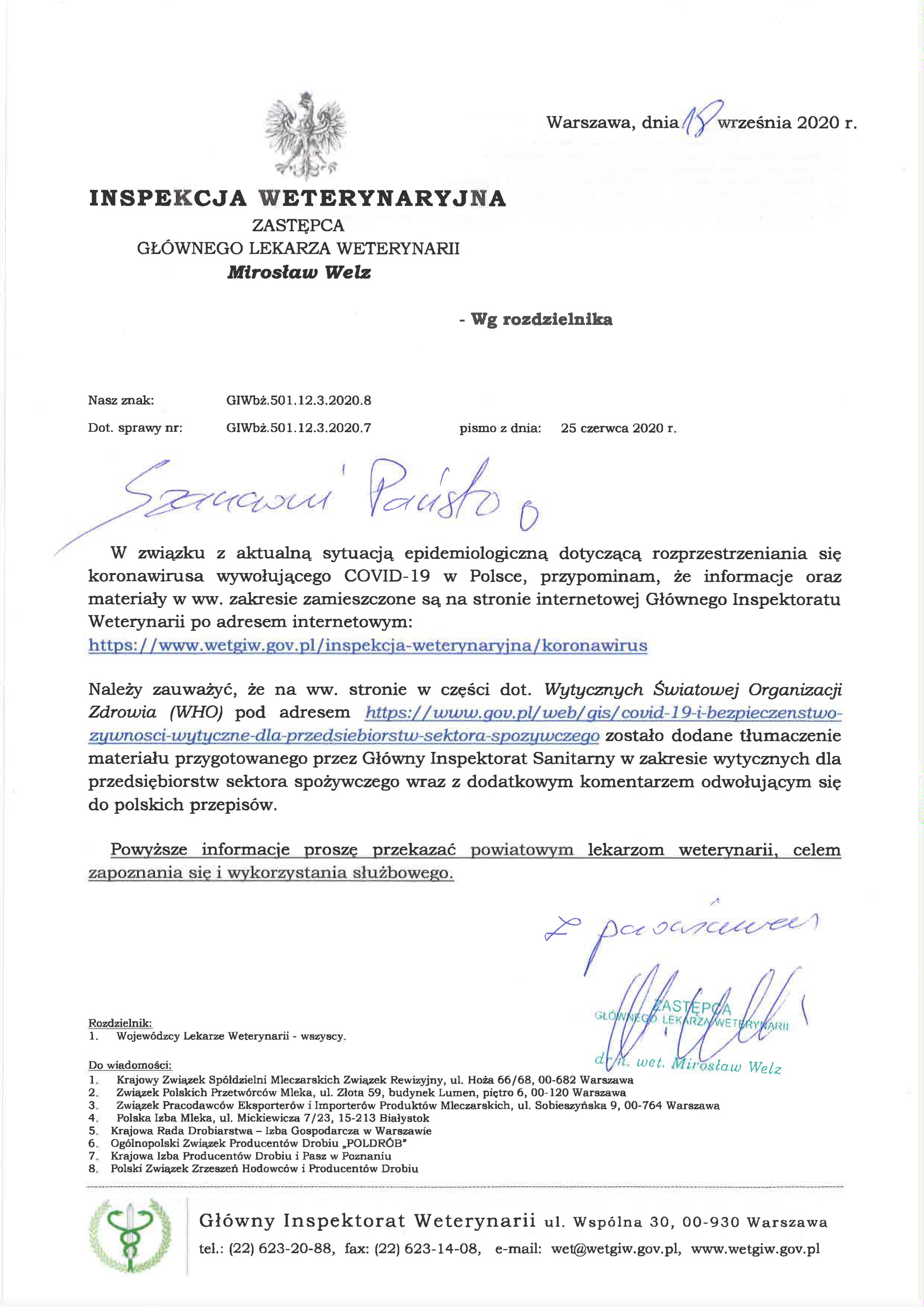 Polska Izba Mleka przekazuje pismo Zastępcy Głównego Lekarza Weterynarii z dnia 18 września 2020 r. o zamieszczonych informacjach i materiałach związanych z sytuacją epidemiologiczną dotyczącą rozprzestrzeniania się koronawirusa.