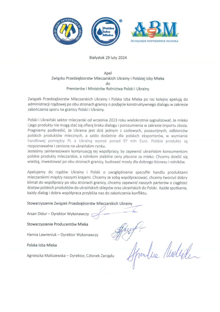 We wspólnie wypracowanym dokumencie Związek Przedsiębiorstw Mleczarskich Ukrainy i Polska Izba Mleka po raz kolejny apelują do administracji rządowej po obu stronach granicy o podjęcie konstruktywnego dialogu w zakresie zakończenia sporu na granicy Polski i Ukrainy.