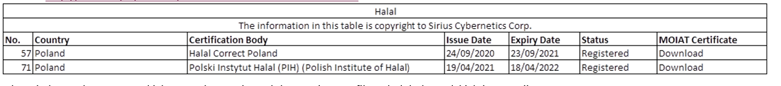 Zgodnie z informacją Ambasady RP w Abu Zabi z 30 czerwca 2021 r., w kwietniu 2021 r. Polski Instytut Halal z Poznania został wpisany, przez właściwe w tym zakresie władze Państwa Zjednoczonych Emiratów Arabskich, na listę instytucji certyfikujących halal (tzw. Certification Body – CB), co oznacza, że Instytut ten jest uprawniony do wystawiania świadectw halal dla art. eksportowanych do PZEA z tym wymogiem.