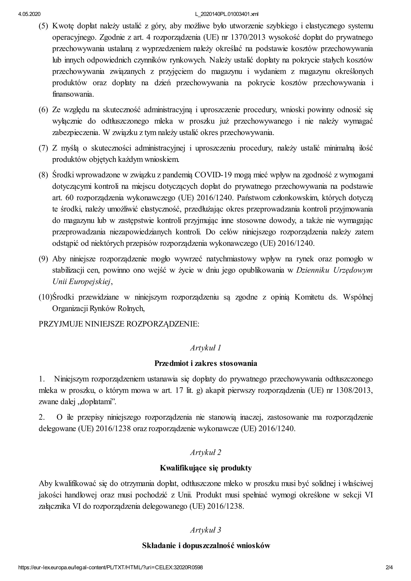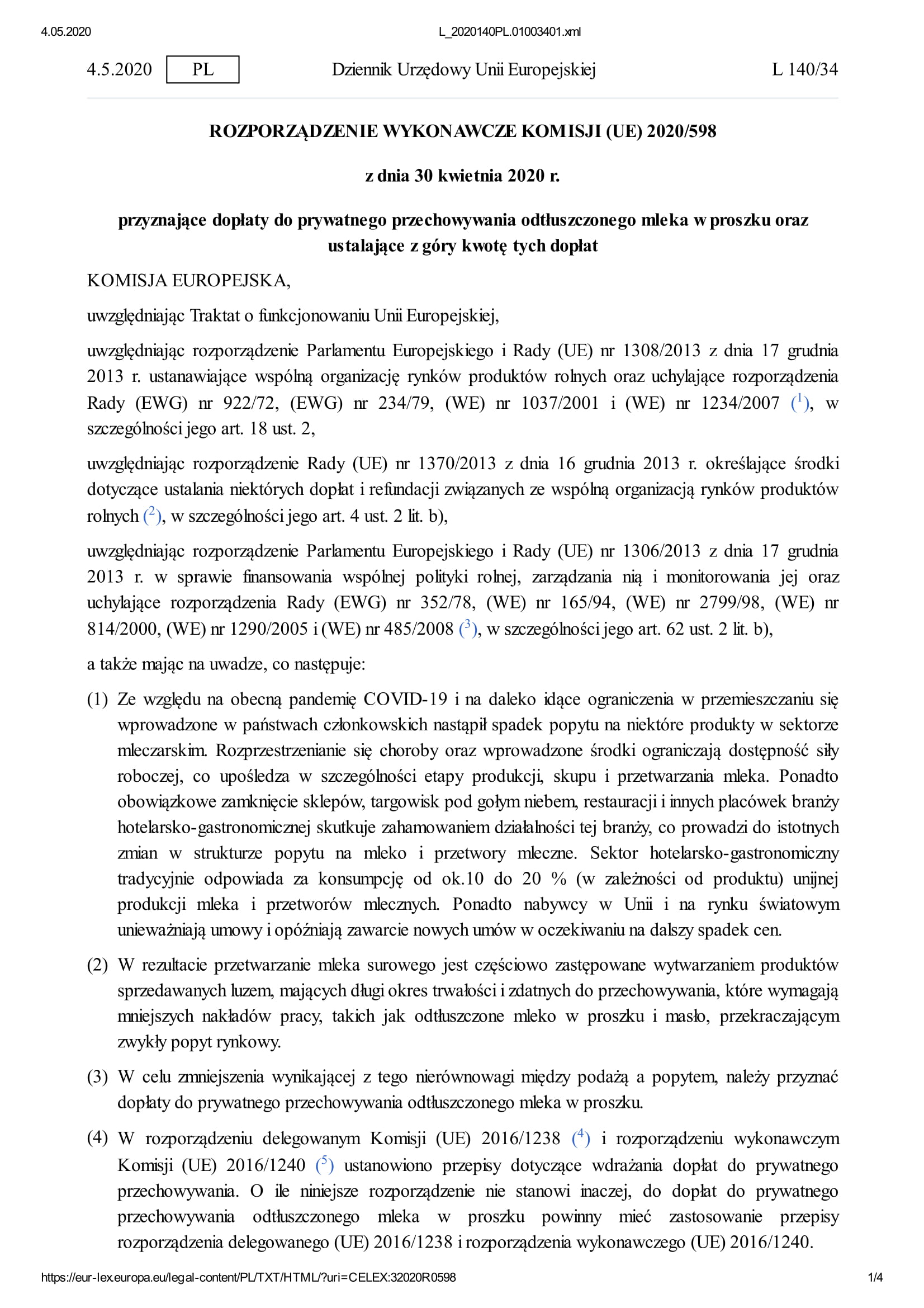 ROZPORZĄDZENIE WYKONAWCZE KOMISJI (UE) 2020/598 z dnia 30 kwietnia 2020 r. przyznające dopłaty do prywatnego przechowywania odtłuszczonego mleka w proszku oraz ustalające z góry kwotę tych dopłat