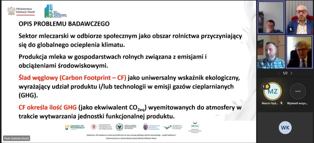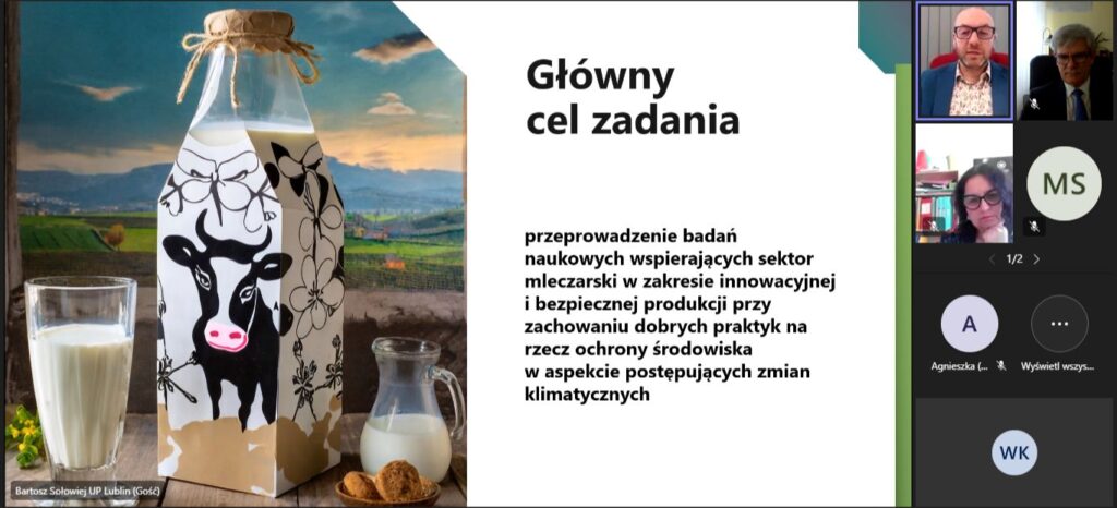 W dniu dzisiejszym (26 marca) miało miejsce, zorganizowane przez Polską Izbę Mleka, spotkanie online z przedstawicielami uczelni realizującymi „Sieć badawczą uczelni przyrodniczych na rzecz rozwoju polskiego sektora mleczarskiego – projekt badawczy” którego celem jest przeprowadzenie badań naukowych wspierających sektor mleczarski w zakresie innowacyjnej i bezpiecznej produkcji przy zachowaniu dobrych praktyk na rzecz ochrony środowiska w aspekcie postępujących zmian klimatycznych.