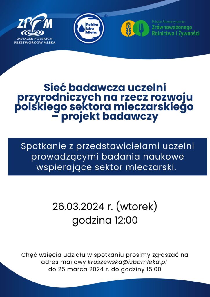 26 marca o godzinie 12:00 zapraszamy Państwa na spotkanie online z przedstawicielami uczelni prowadzącymi „Sieć badawczą uczelni przyrodniczych na rzecz rozwoju polskiego sektora mleczarskiego – projekt badawczy” którego celem jest przeprowadzenie badań naukowych wspierających sektor mleczarski w zakresie innowacyjnej i bezpiecznej produkcji przy zachowaniu dobrych praktyk na rzecz ochrony środowiska w aspekcie postępujących zmian klimatycznych.