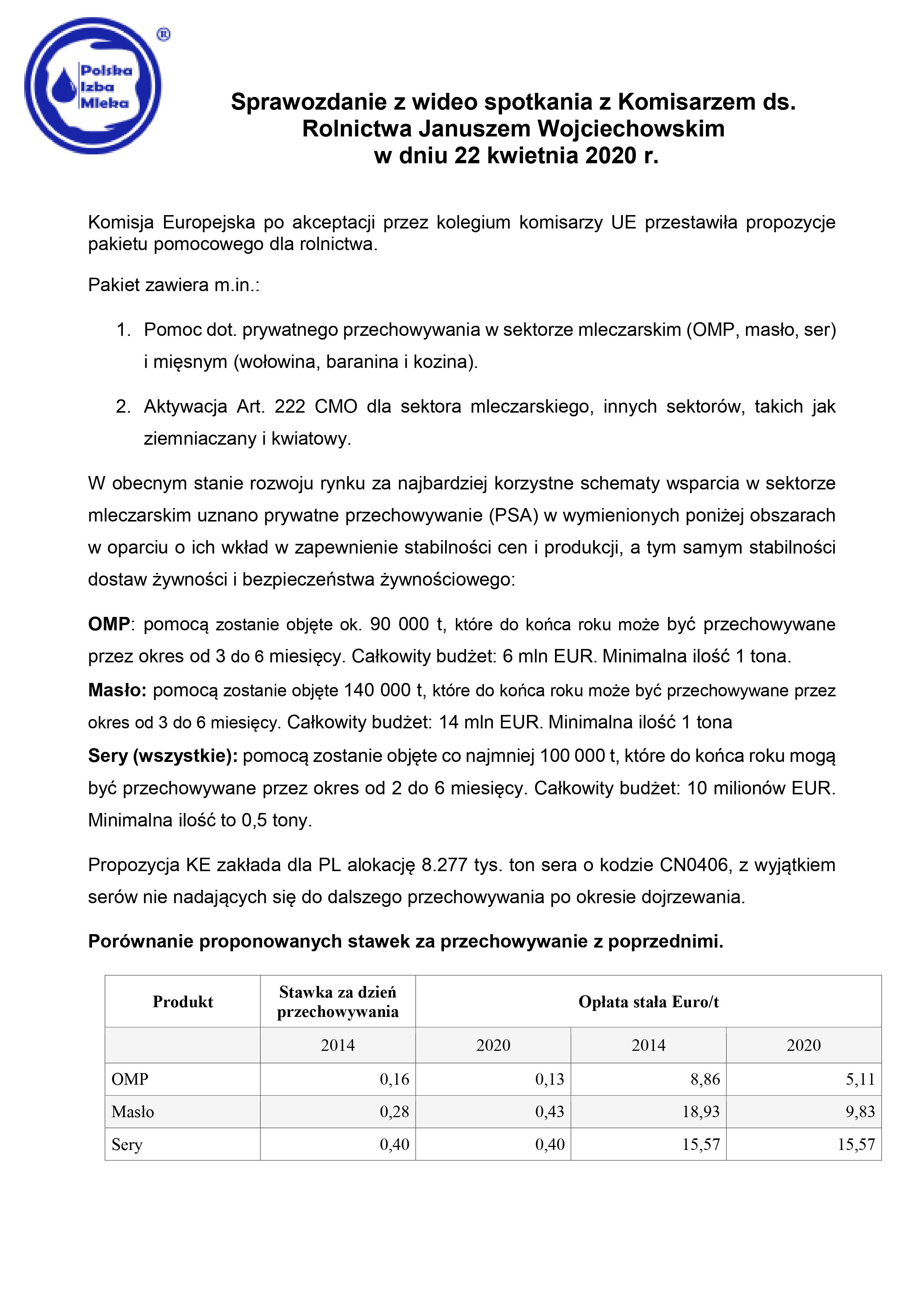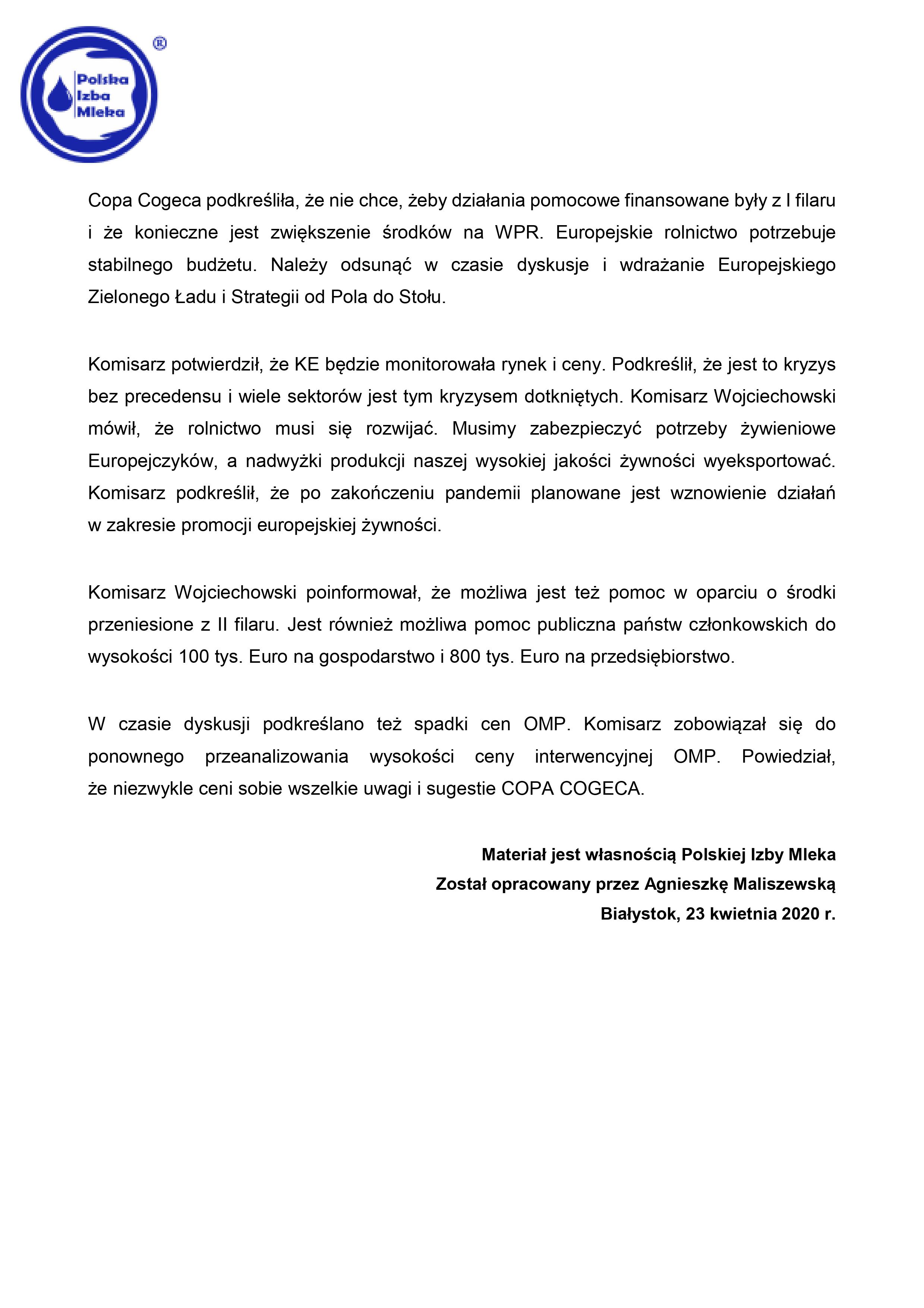 Sprawozdanie z wideo spotkania z Komisarzem ds. Rolnictwa Januszem Wojciechowskim w dniu 22 kwietnia 2020 r.