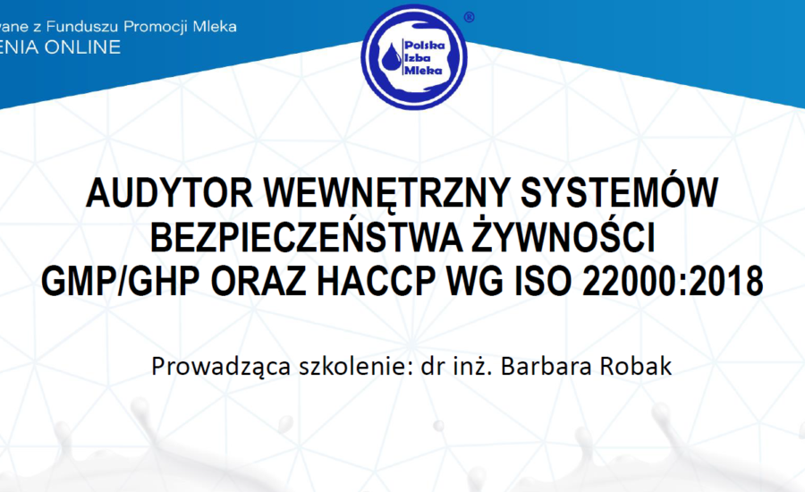 Szkolenie online pt. AUDYTOR WEWNĘTRZNY SYSTEMÓW BEZPIECZEŃSTWA ŻYWNOŚCI GMP/GHP ORAZ HACCP WG ISO 22000:2018, sfinansowane z Funduszu Promocji Mleka