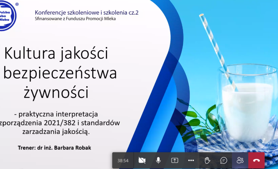 W dniu dzisiejszym tj. 15.12.2021 r. Polska Izba Mleka realizuje szkolenie online pt. Kultura jakości i bezpieczeństwa żywności – praktyczna interpretacja rozporządzenia 2021/382 i standardów zarzadzania jakością, organizowane w ramach zadania pt. Konferencje szkoleniowe i szkolenia cz. II, sfinansowanego z Funduszu Promocji Mleka.