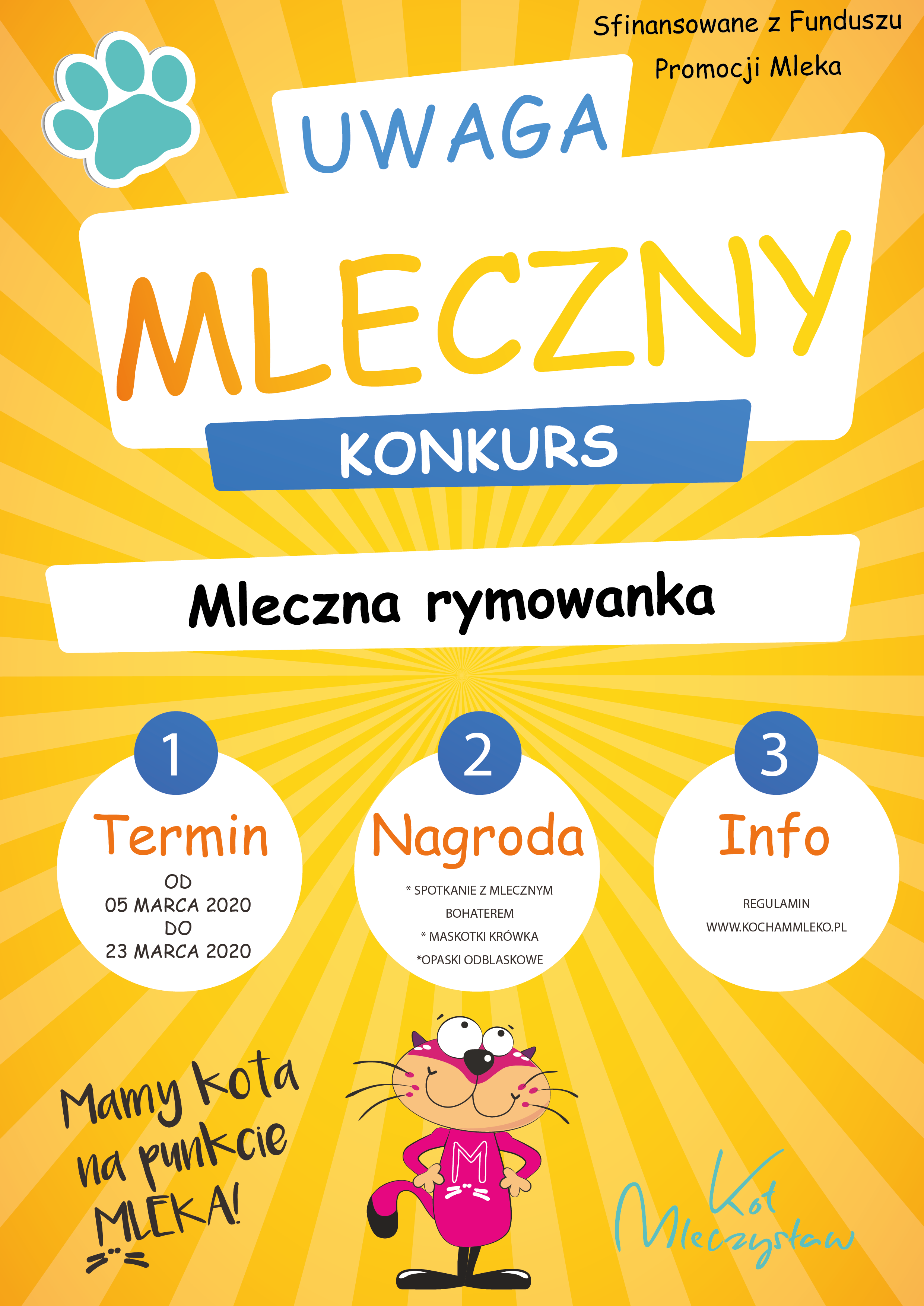 Program „Mamy kota na punkcie mleka” sfinansowany z Funduszu Promocji Mleka zaprasza do udziału w konkursie „Mleczna rymowanka”, który trwa od 5 marca do 23 marca 2020 roku. W mlecznej zabawie mogą wziąć udział placówki z całej Polski, które przystąpiły do programu.