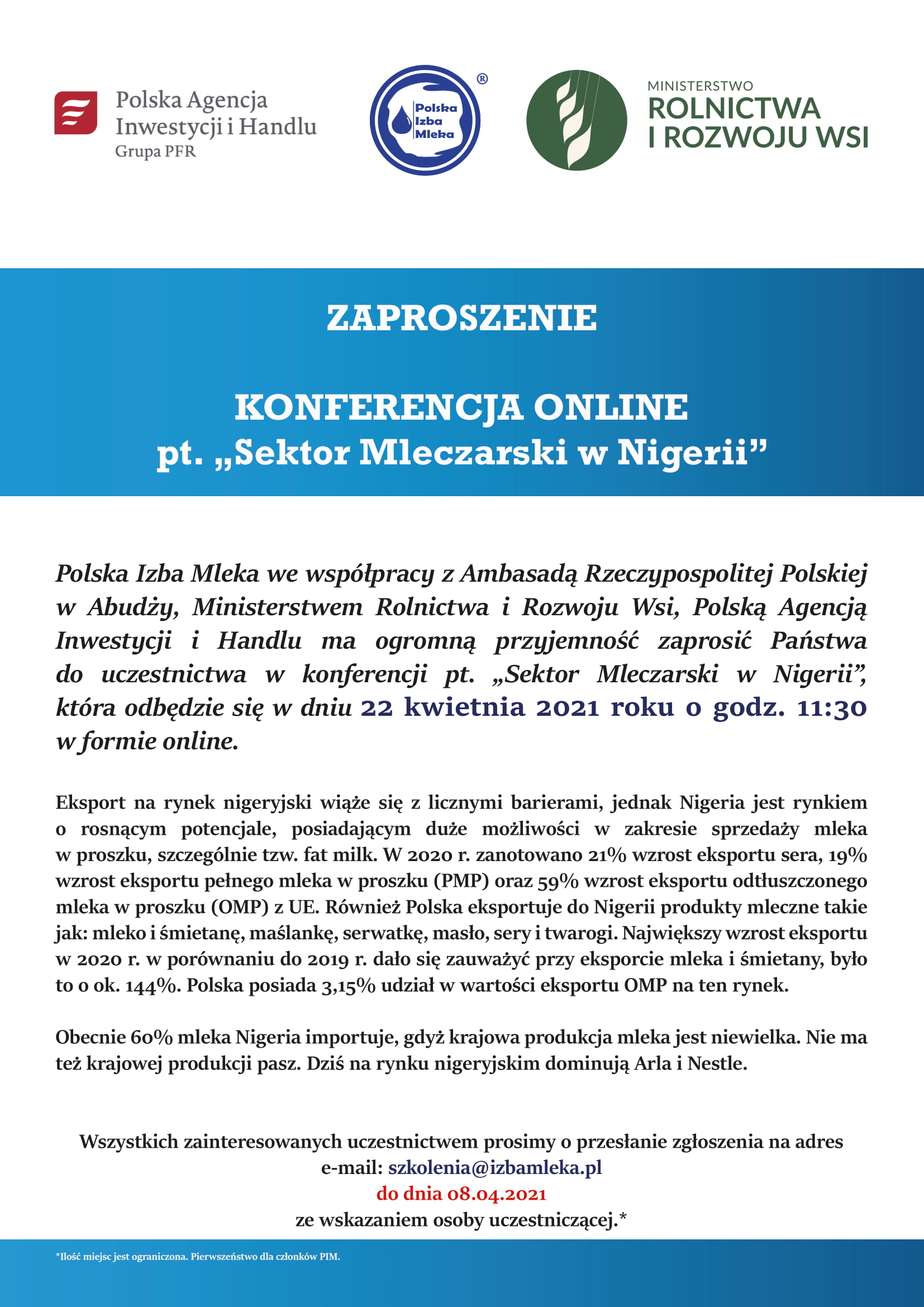 Polska Izba Mleka we współpracy z Ambasadą Rzeczypospolitej Polskiej w Abudży, Ministerstwem Rolnictwa i Rozwoju Wsi, Polską Agencją Inwestycji i Handlu ma ogromną przyjemność zaprosić Państwa do uczestnictwa w konferencji pt. „Sektor Mleczarski w Nigerii”, która odbędzie się w dniu 22 kwietnia 2021 roku o godz. 11:30 w formie online.