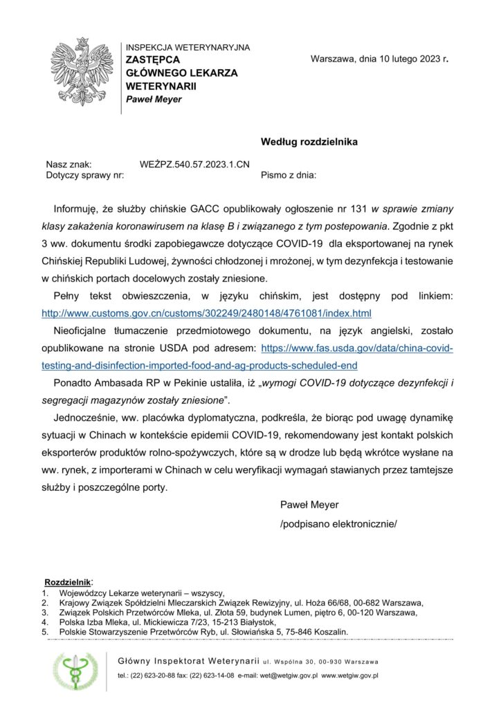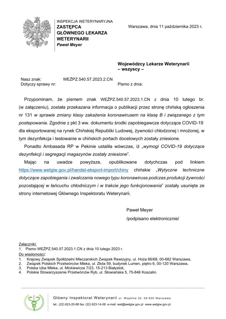 Po interwencji Polskiej Izby Mleka „Wytyczne techniczne dotyczące zapobiegania i zwalczania nowego typu koronawirusa podczas produkcji żywności pozostającej w łańcuchu chłodniczym i w trakcie jego funkcjonowania” zostały usunięte ze strony internetowej Głównego Inspektoratu Weterynarii.